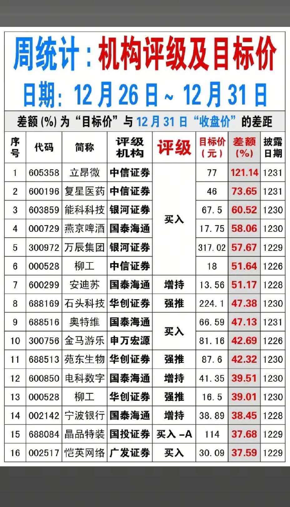 2026年1月1日,A股这些股票有望大爆发!!! 立昂微目标价77,差额121.14%,后市值得高看一眼;复星医药目标价46,差额73.65%,后市值得期待;能科科技目标价67.5,差额60.52%,后市值得重点关注!!!