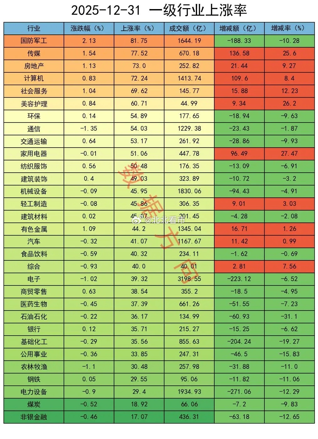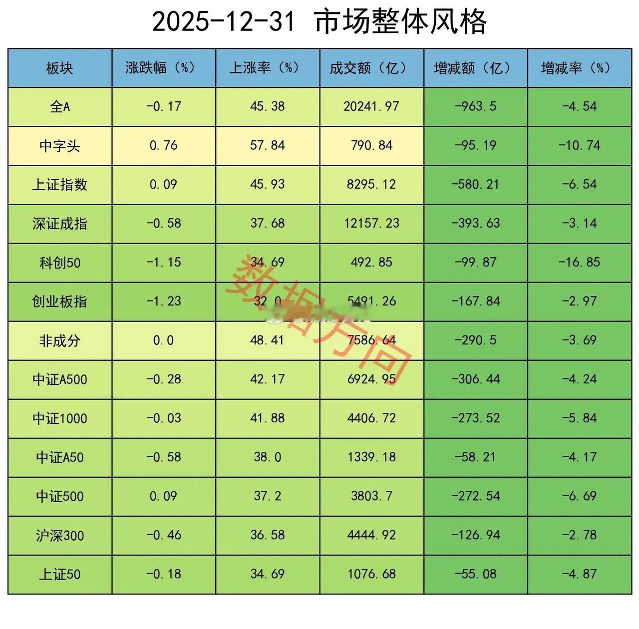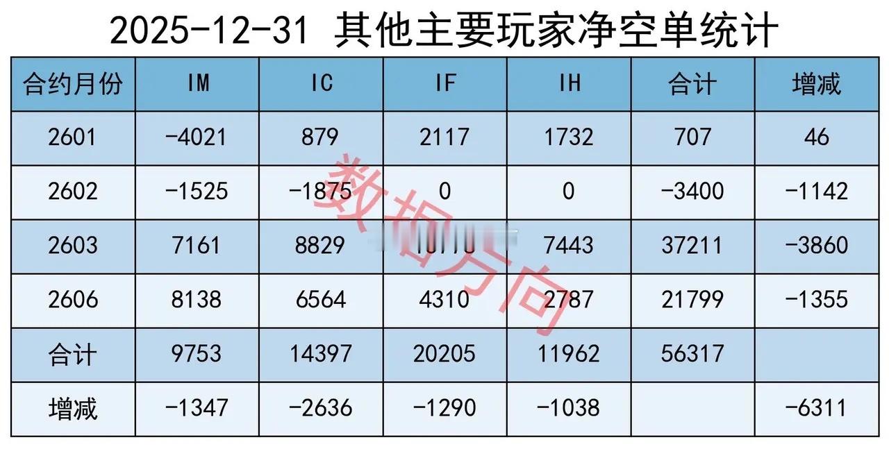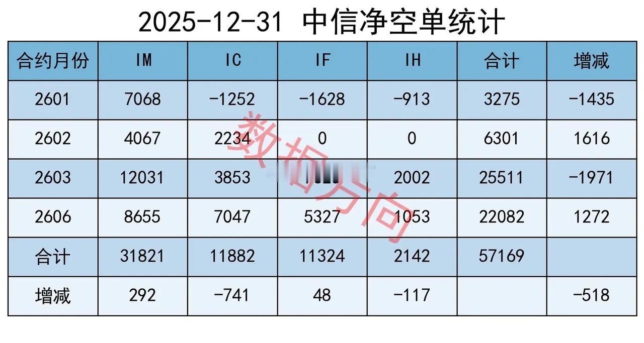 2025年收官之战,机构大幅减空今天是2025年最后一个交易日,大盘延续了窄幅整理之势,全A指数跌幅0.17%,个股上涨率45%,成交额较昨日缩量5%。上证指数,涨0.09%,其在收盘前的这一段时间走出了气势如虹的11连阳。其在今年的涨幅为18.41%。创业板指、科创50指数,跌幅分别为1.23%、1.15%,在所有宽指中跌得最多。但从全年来看,此两个指数分别大涨49.57%、35.92%,还是非常不错的。从复盘数据来看,机构们采取了大幅减空的操作。行业国防军工,涨幅2.13%,个股上涨率82%,此两项数据皆是全场最佳商业航天持续火热。消息上,12月30日,海南省航天领导小组会议在海口召开,听取海南商业航天发射场2026年发射计划安排、商业发射任务组织指挥模式优化、相关系统和配套项目论证建设等情况汇报,研究部署下一步工作。随着中国星网和G60千帆星座先后进入批量化发射阶段,大运力、低成本趋势正引领商业航天开启新时代。传媒、计算机,一起进入榜单前4名AI应用方向延续活跃。1层工作会议明确推动AI与实体经济融合,发布《AI 应用产业升级行动计划(2026-2030 年)》,计划培育100个以上标杆场景。从行业基本面来看,2025年4季度,AI 应用板块净利润同比平均增长 65%,工业 AI 订单增长 120%,政务 AI 营收占比提升至 35%,消费 AI 硬件销量增长 70%。热力图本图用于观察市场整体强度结构。有色金属(97)、国防军工(97)、通信(95),强度都在90以上。国防军工(97)、机械设备(80)、汽车(59)、家用电器(48)、电力设备(38),高端制造方向的平均强度为64。有色金属(97)、石油石化(88)、基础化工(81)、钢铁(63)、煤炭(20)、公用事业(19),大宗商品方向的平均强度为61。高端制造、大宗商品的强度较昨日有所回退,但仍然是当前最强的两大方向。再开盘,就是2026年一季度了,是一个重要的时间节点,市场的强度结构也许会有新的变化。期指持仓某信,减空518手;分别对IF、IM加空48手、292手,分别对IH、IC减空117手、741手;平仓买单5445手,平仓卖单5963手。其他主要玩家,减空6311手;四大品种全部减空,分别对IH、IF减空1038手、1290手,分别对IC、IM减空2636手、1347手;平仓买单14562手,平仓卖单20873手。今天是2025年最后一个交易日,本来还有一点小小的预期,希望能够站上4000点,结果仅仅只是窄幅整理。这样也挺好,2026开门红可以更容易一些。两者合计减空6829手,以平仓卖单为主,力度不错,只看今天应该是较好的信号。合计对IH、IF减空2397手,合计对 IC、IM减空4432手操作完成后,共持有净空单113486手。感谢大家一直以来的支持,咱们2026年再见!