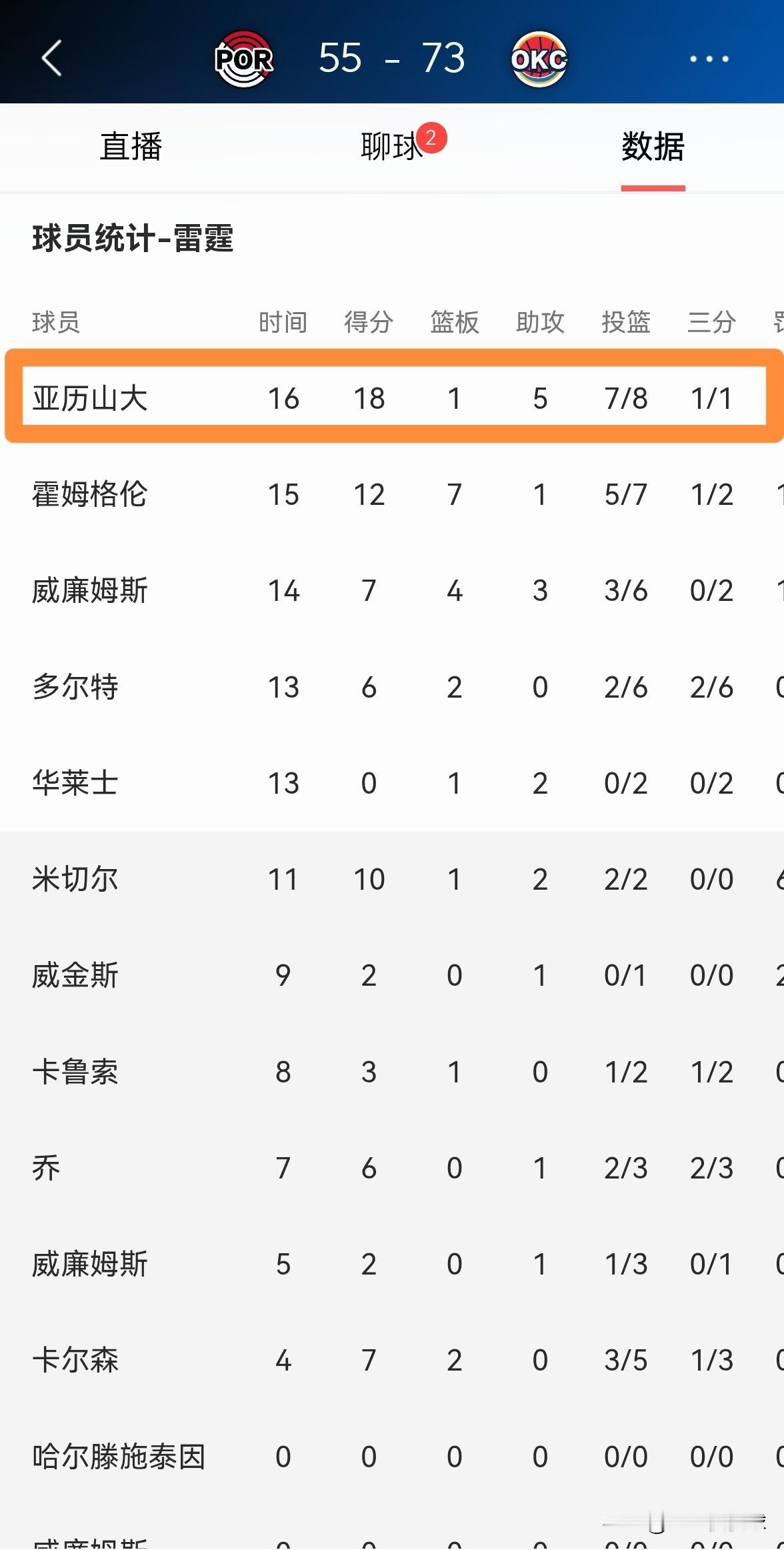 雷霆巨星亚历山大的效率真是奇高无比!在今天雷霆主场迎战开拓者的比赛中,目前双方半场战罢,雷霆以73:55领先对手。在前两节比赛中,亚历山大的状态真是极其火热,他在首发出战的16分钟里,投篮8中7,其中三分球1中1、罚球3中3极其高效的砍下18分,还有5助攻2抢断,没有出现任何的失误,他的场上正负值为+17。 值得注意的是,在上半场比赛中,亚历山大仅仅获得了3次罚球,其中还包括1次技术罚球。