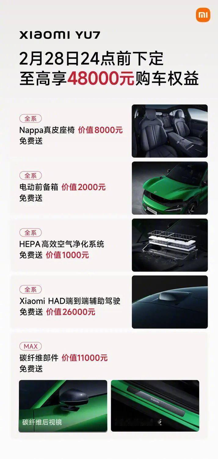 军儿由于直播活动推迟,送新年福利。 YU7 这两个月购买: 全系可享3年0息,首付7.49万,月供可低至4961元。试驾另送1:64合金车模。 你会去购买吗?