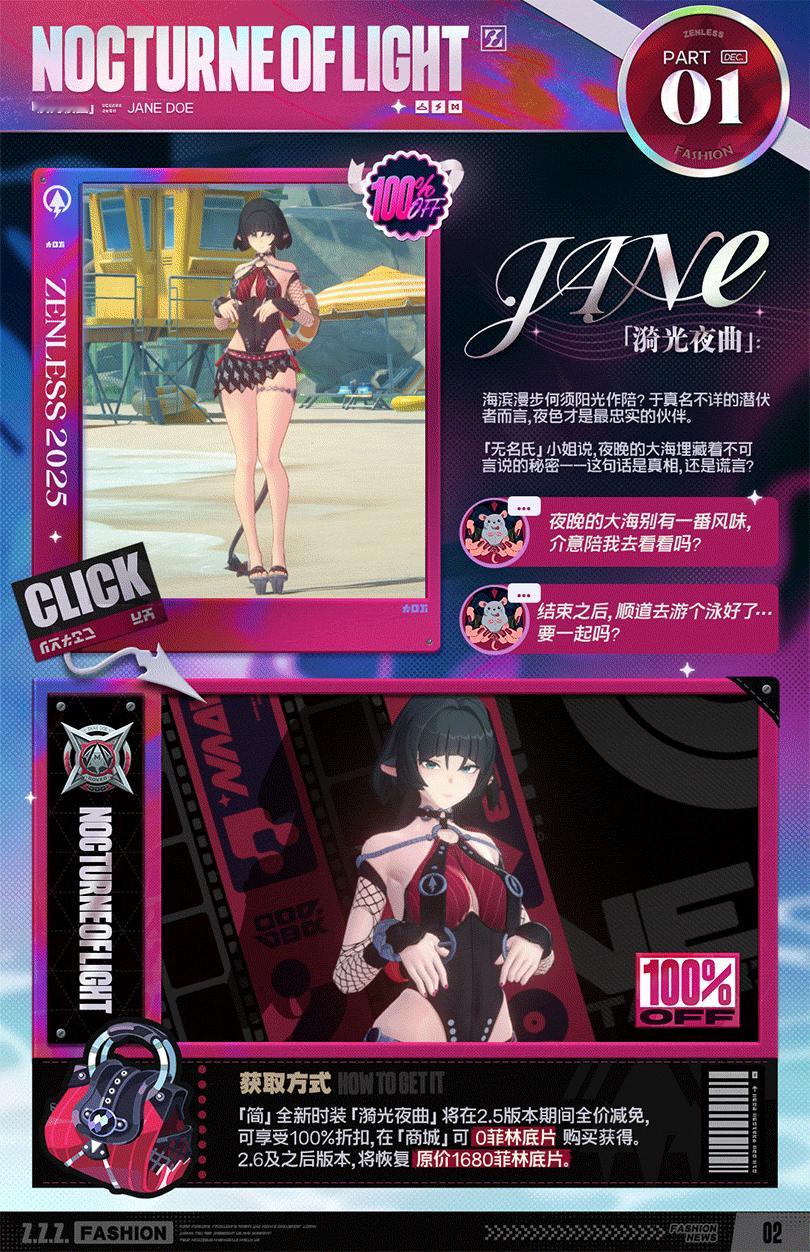 《绝区零》超大胆时装免费《绝区零》官方近日正式揭晓了人气角色简·杜的全新时装——「漪光夜曲」。这套设计风格大胆、充满质感的衣装,将这位“无名氏”小姐亦正亦邪、魅影交织的特质展现得淋漓尽致。从官方发布的细节来看,这套新装充满了细节控的诚意:黑色项圈与银色链条交织,步伐间冷冽作响,展现出一种精致的叛逆;黑色围裙上的闪电与鼠尾纹样,象征着暗影中迅捷的魅影。最吸引眼球的莫过于腿间的银色金属束带,荧幕上规律跳动的粉色电波正实时监测着心率,仿佛在暗示这一场夜色漫步背后的心跳与危险。简的这套「漪光夜曲」新装在2.5版本期间开启“全价减免”活动。在商城以“0菲林底片”直接购买获得。需要注意的是,从2.6版本起,该时装将恢复原价1680菲林底片。