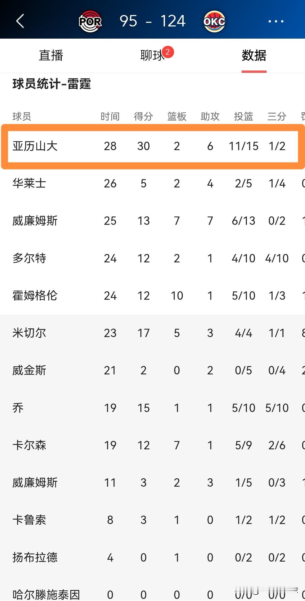 我真是懒得再称赞雷霆巨星亚历山大了!在今天雷霆主场以124:95大胜开拓者的比赛中,亚历山大在攻防两端都打出了无可挑剔的表现。 整场比赛下来,亚历山大首发出战28分钟,投篮15中11,其中三分球2中1、罚球7中7轻松砍下30分,还有2篮板6助攻4抢断,他的场上正负值为+22。 作为当今联盟排名前三的超级巨星,我们对亚历山大的出色表现早已经习以为常了。