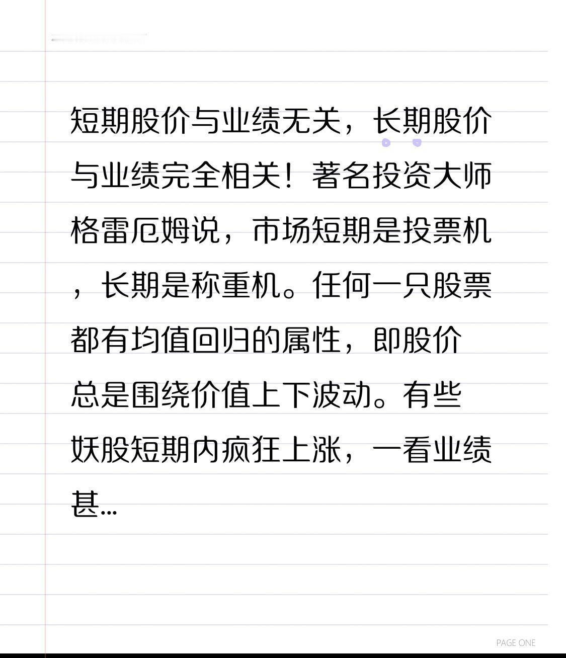短期股价与业绩无关,长期股价与业绩完全相关! 著名投资大师格雷厄姆说,市场短期是投票机,长期是称重机。任何一只股票都有均值回归的属性,即股价总是围绕价值上下波动。 有些妖股短期内疯狂上涨,一看业绩甚至亏损,而市盈率、负债率却高企。这样的企业白送都不要,怎样涨上去还要怎样跌下来,甚至退市。损失的还是广大投资者,而管理层早在高位套现离场了。 有些股票明明业绩很好,就是不涨,也不用担心,它早晚要回归均值,甚至在惯性作用下超过均值。就像钟摆,摆到最低点后不会停止,还会摆向另一个极点。 市场先生短期看是很不理性的,长期看是很理性的。