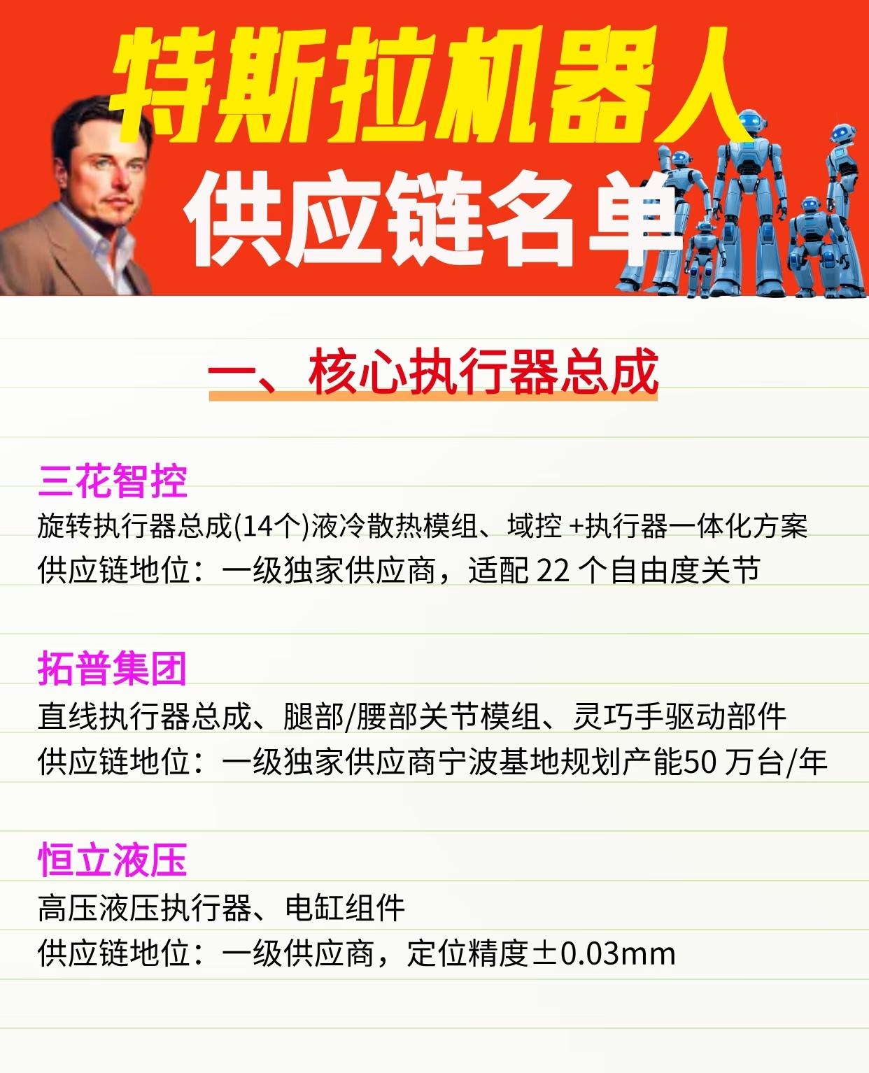 特斯拉机器人供应链名单可总结如下: 一、核心执行器总成 - 三花智控:提供旋转执行器总成(含液冷散热模组、域控+执行器一体化方案),是一级独家供应商,适配22个自由度关节。 - 拓普集团:供应直线执行器总成、腿部/腰部关节模组、灵巧手驱动部件,是一级独家供应商,宁波基地规划年产能50万台。 - 恒立液压:供应高压液压执行器、电缸组件,是一级供应商,定位精度达±0.03mm。 二、精密传动系统 - 绿的谐波:提供14个定制RV-HP系列谐波减速器,由墨西哥工厂独家供货,精度误差≤5弧秒。 - 五洲新春:供应行星滚柱丝杠、精密轴承和谐波减速器,是二级核心供应商,产品完全替代进口。 三、感知与控制部件 - 长盈精密:提供指尖传感器柔性板(独家)、触觉传感器、关节齿轮/轴承,是一级供应商,关节壳体供应占比达70%。 - 蓝思科技:供应外壳结构件、视觉模组盖板、20层高密度主控PCB,是一级供应商,负责整机组装配套。 四、其他核心部件 - 卧龙电驱:供应伺服电机、关节驱动电机,是一级供应商,适配高扭矩场景。 - 浙江荣泰:供应耐高温绝缘材料、关节密封件,是二级独家供应商,保障关节稳定性。 - 伟创电气:供应伺服驱动器、运动控制器,是二级核心供应商,适配Optimus运动控制需求。 这些企业覆盖了特斯拉机器人的核心执行器、传动、感知控制及其他关键部件,形成较完整的供应链体系。