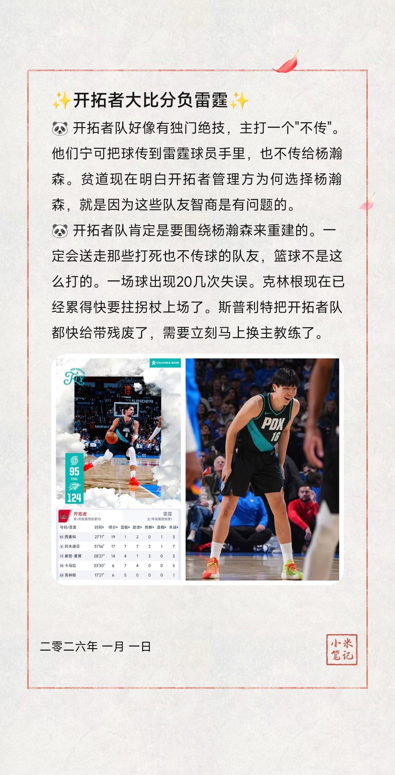 🐼 开拓者队好像有独门绝技,主打一个"不传"。他们宁可把球传到雷霆球员手里,也不传给杨瀚森。贫道现在明白开拓者管理方为何选择杨瀚森,就是因为这些队友智商是有问题的。 🐼 开拓者队肯定是要围绕杨瀚森来重建的。一定会送走那些打死也不传球的队友,篮球不是这么打的。一场球出现20几次失误。克林根现在已经累得快要拄拐杖上场了。斯普利特把开拓者队都快给带残废了,需要立刻马上换主教练了。 作者:龙须面🧐
