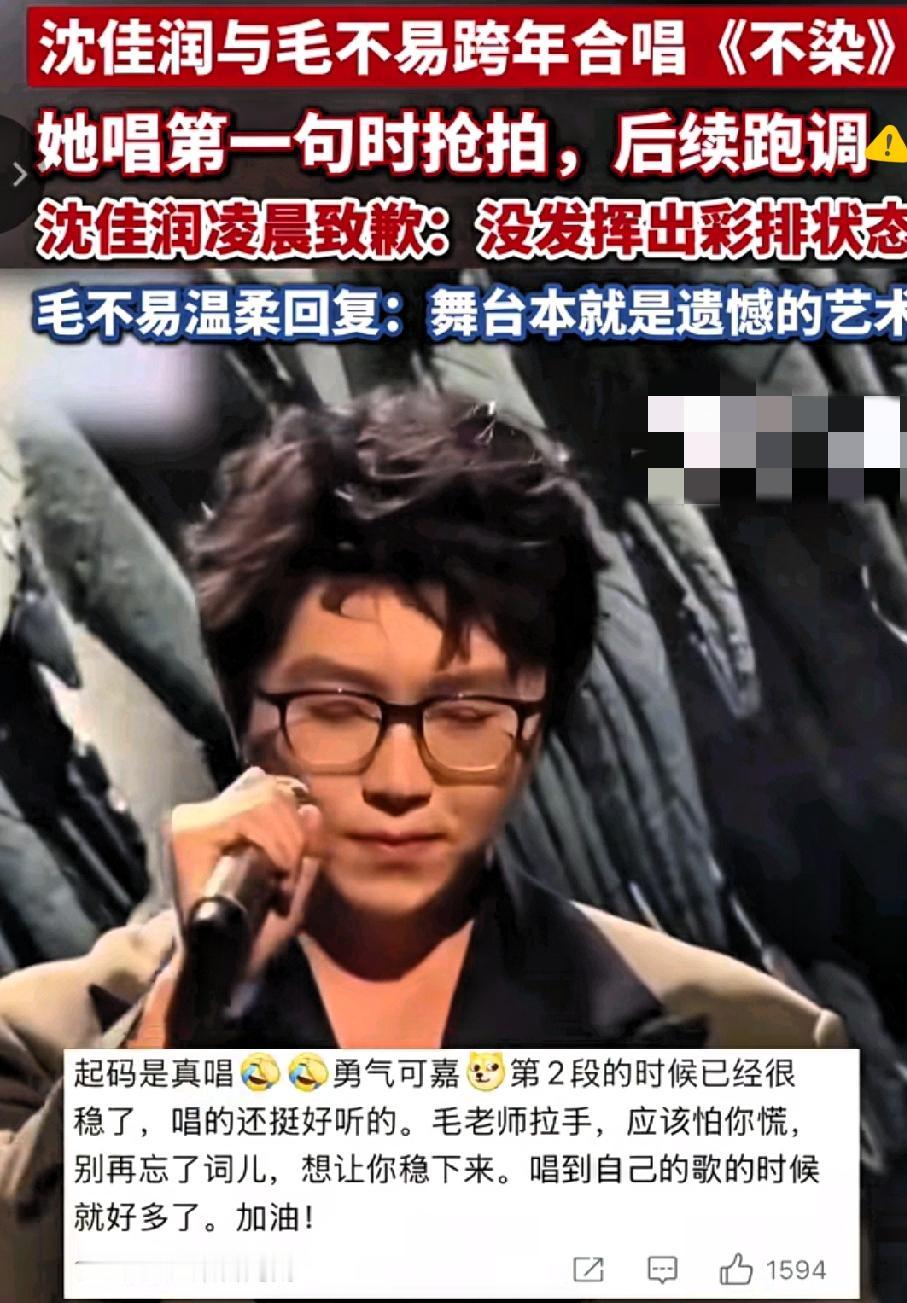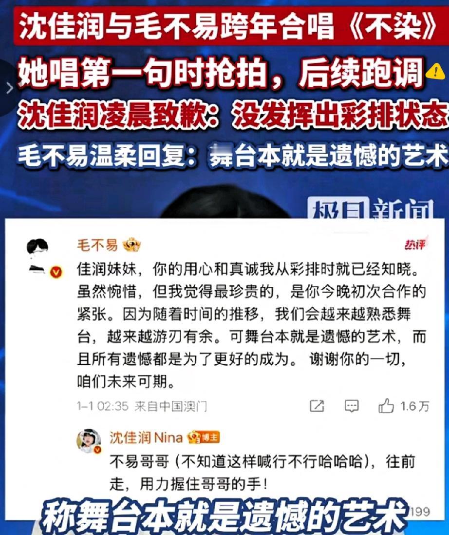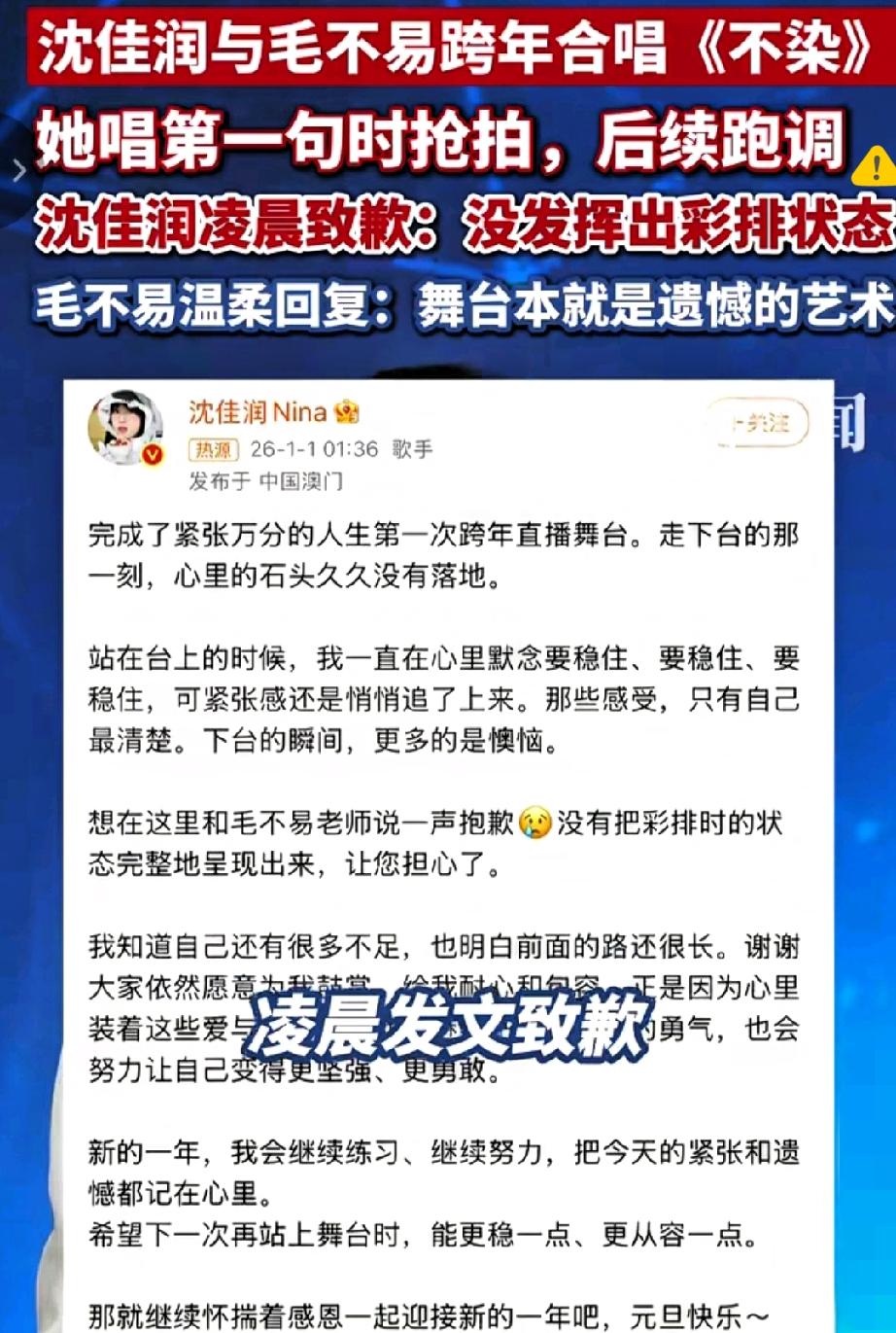 这波热搜太暖了! 沈佳润跨年舞台跑调后连夜道歉,毛不易的回应直接戳中人心,这才是娱乐圈该有的双向奔赴啊! 19岁的她首登跨年大舞台,和毛不易合唱《不染》时抢拍、破音,下台就真诚致歉,不甩锅不找补,这份担当比完美表演更圈粉。 而毛不易那句“舞台本就是遗憾的艺术”,既化解了尴尬,又给了新人成长空间,舞台上悄悄握手鼓励的细节,更是尽显前辈风范。 比起揪着失误吐槽,这种“犯错敢认、前辈愿扶”的氛围才更难得。 新人需要包容的土壤,前辈需要温柔的格局,观众也该少点苛责多点耐心。 你觉得娱乐圈该给新人多少试错空间?评论区聊聊~