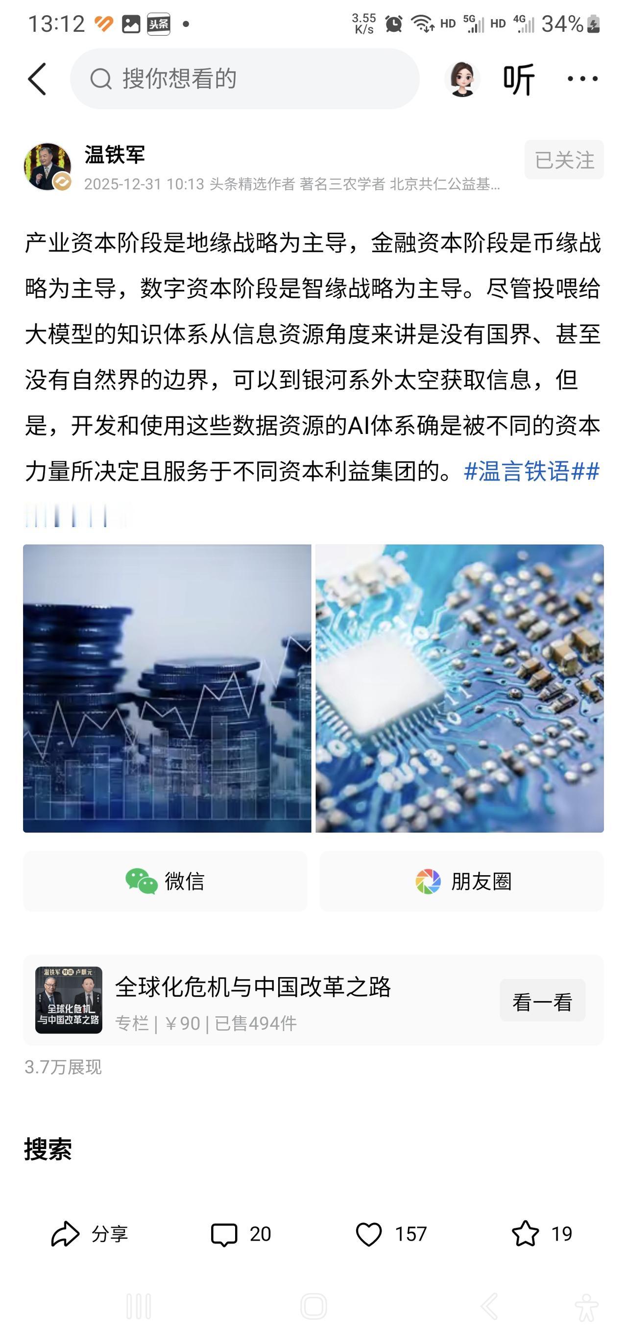 温铁军教授今天发表了一个微头条,说世界竞争从“地缘”到“币缘”,现在进入了“智缘战略”。 里面一堆抽象名词,看得人头大。我琢磨了半天,用游戏语言翻译一下,其实就是人类争霸游戏的版本更新了。 [鼓掌]1.0版本是抢地盘游戏。工业革命后,列强满世界抢殖民地,谁地盘大、工厂多,谁就是大佬。这叫产业资本阶段,玩的是地缘战略。典型操作就是两次世界大战。 [鼓掌]2.0版本是印钱游戏。地盘瓜分完了,玩法升级。美国靠着石油美元和华尔街掌握了全球的货币发行权,能用美元潮汐收割全球,能用SWIFT体系当金融武器,这叫金融资本阶段,玩的是币缘战略。看看现在的国际金融体系就懂了,不是说制裁俄罗斯就立马把他提出SWIFT体系了吗。 [鼓掌]现在3.0版本到来了可以把它【养成“最强大脑”游戏】。地盘和印钞权格局都相对固化了,新的战场是数字空间和智能技术。谁掌握了最牛的AI、最多的数据、最强的算力,谁就能定义未来所有游戏的规则。这就是数字资本阶段,温教授说的智缘战略。 [鼓掌]这个新游戏有两个关键设定: 第一,一个是AI国籍的问题。全世界的数据看似公开流动,但谁能处理、怎么用,全看背后的AI大脑听谁的。这大脑是美国养出来的,还是我们自己练出来的,结果天差地别。 第二,未来一切都在数字化,包括手中的钱。以前币缘战打的是传统货币,未来打的可能就是数字货币。为啥各国都在悄悄搞自己的数字货币(包括我们的数字人民币)?这不仅是支付方便,这是在为未来的修金融盾牌和桥梁。 [心]对我们普通人来说,这些国家间战略的竞争往往可以给我们一些启示,数据AI芯片算力会是国家的核心竞争力,所以以后给孩子们选择行业、学习技能,得往这个方向靠。