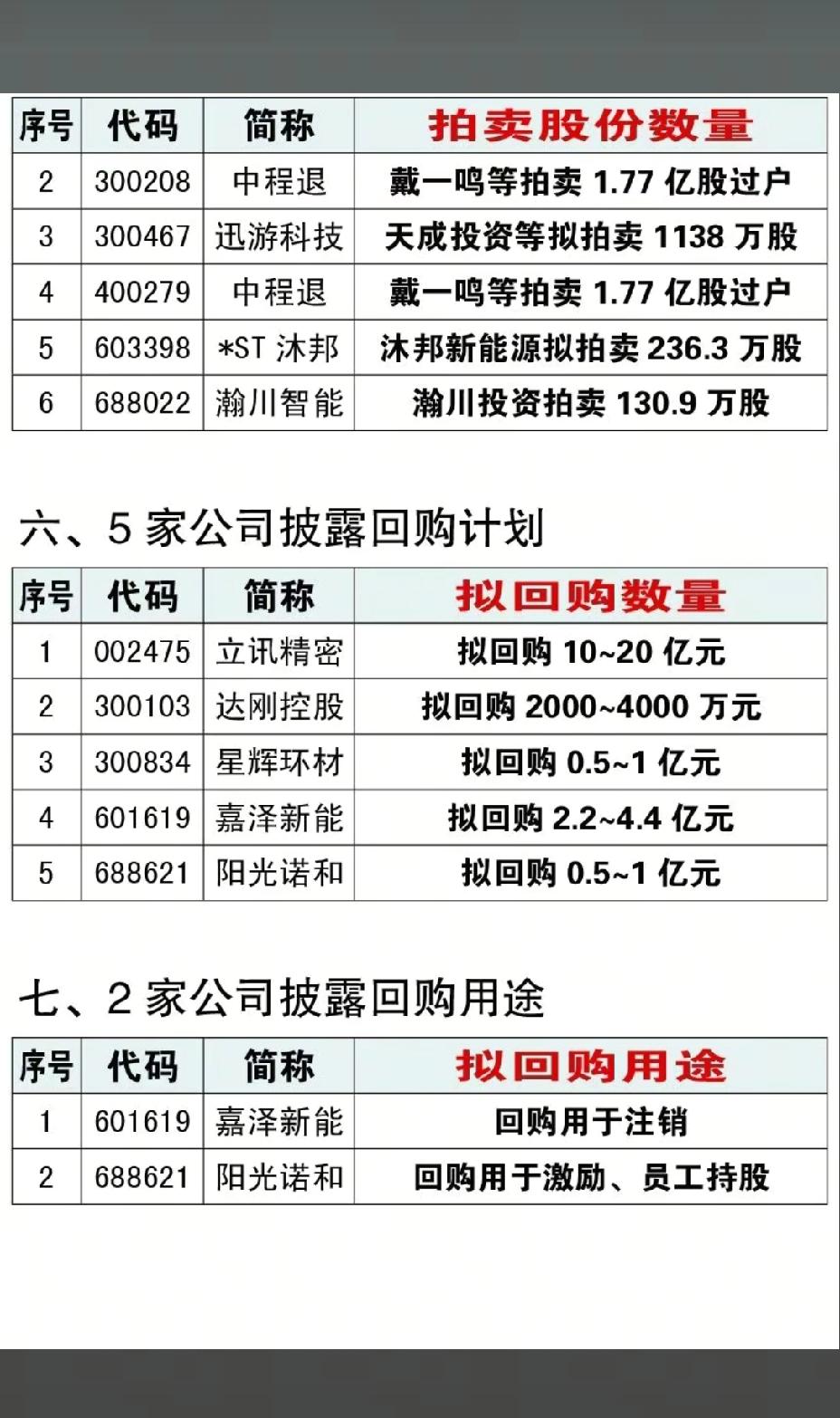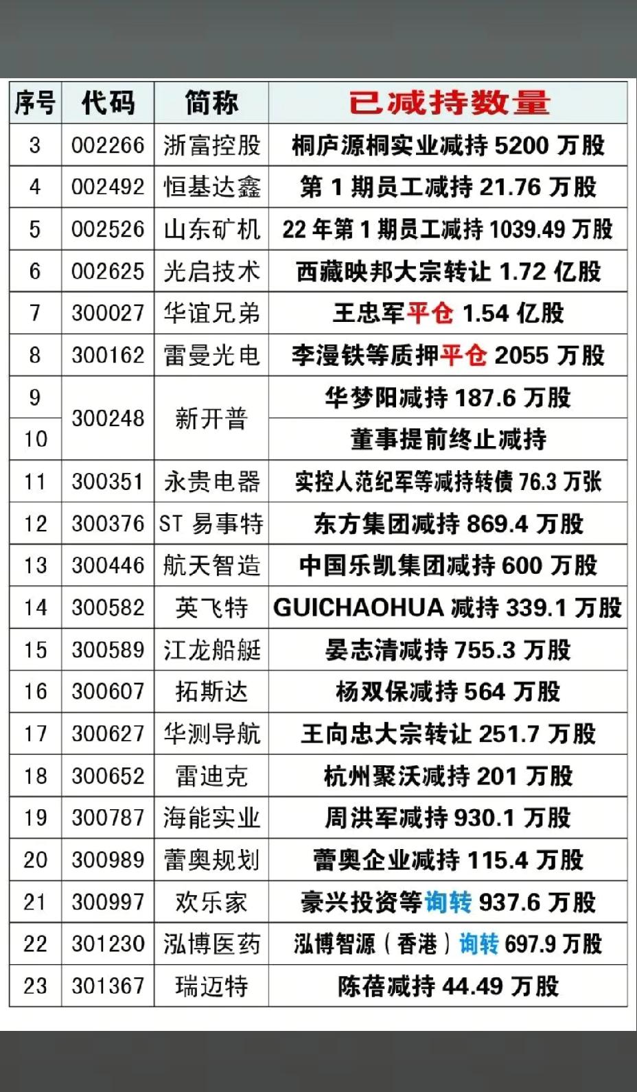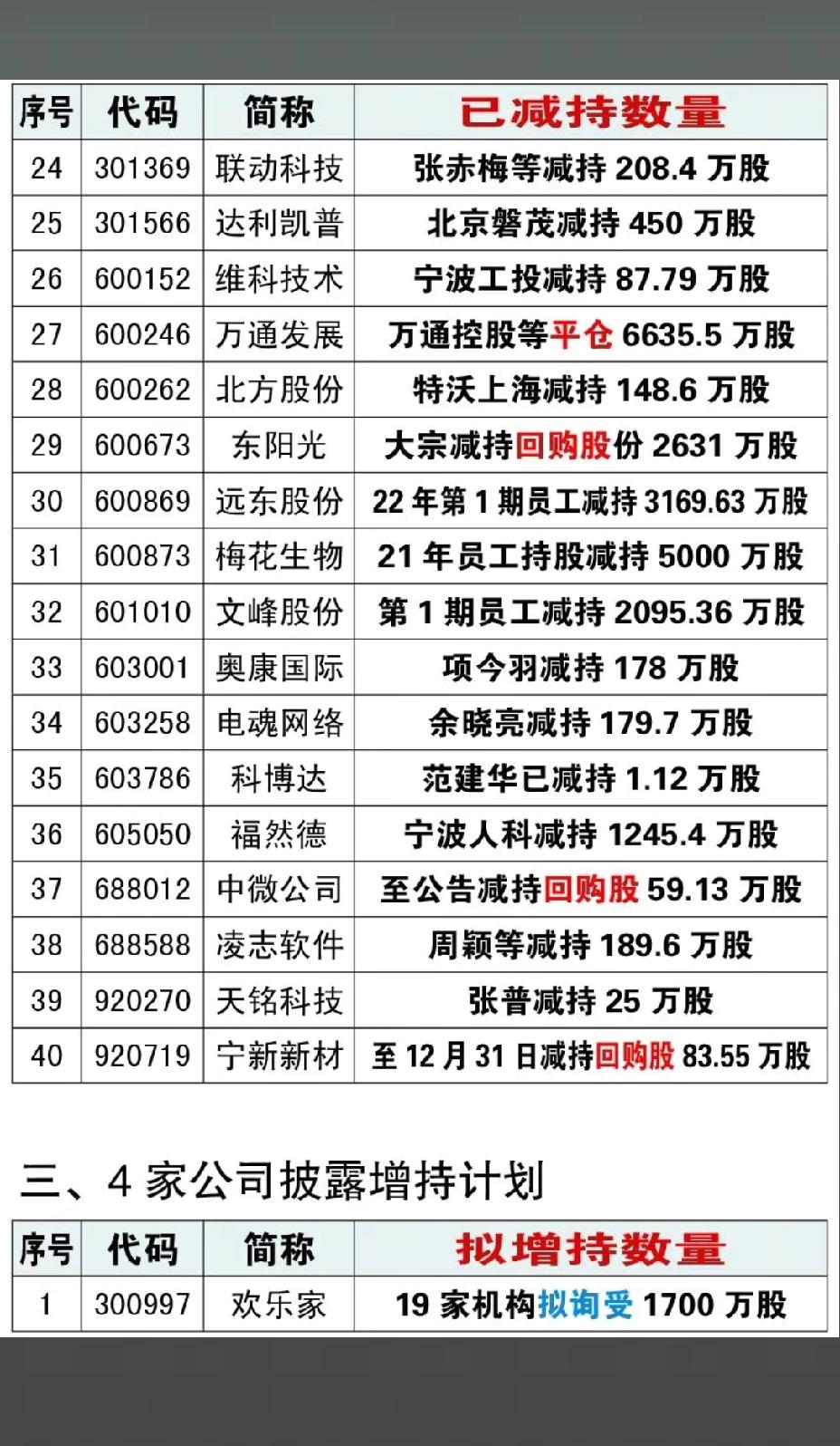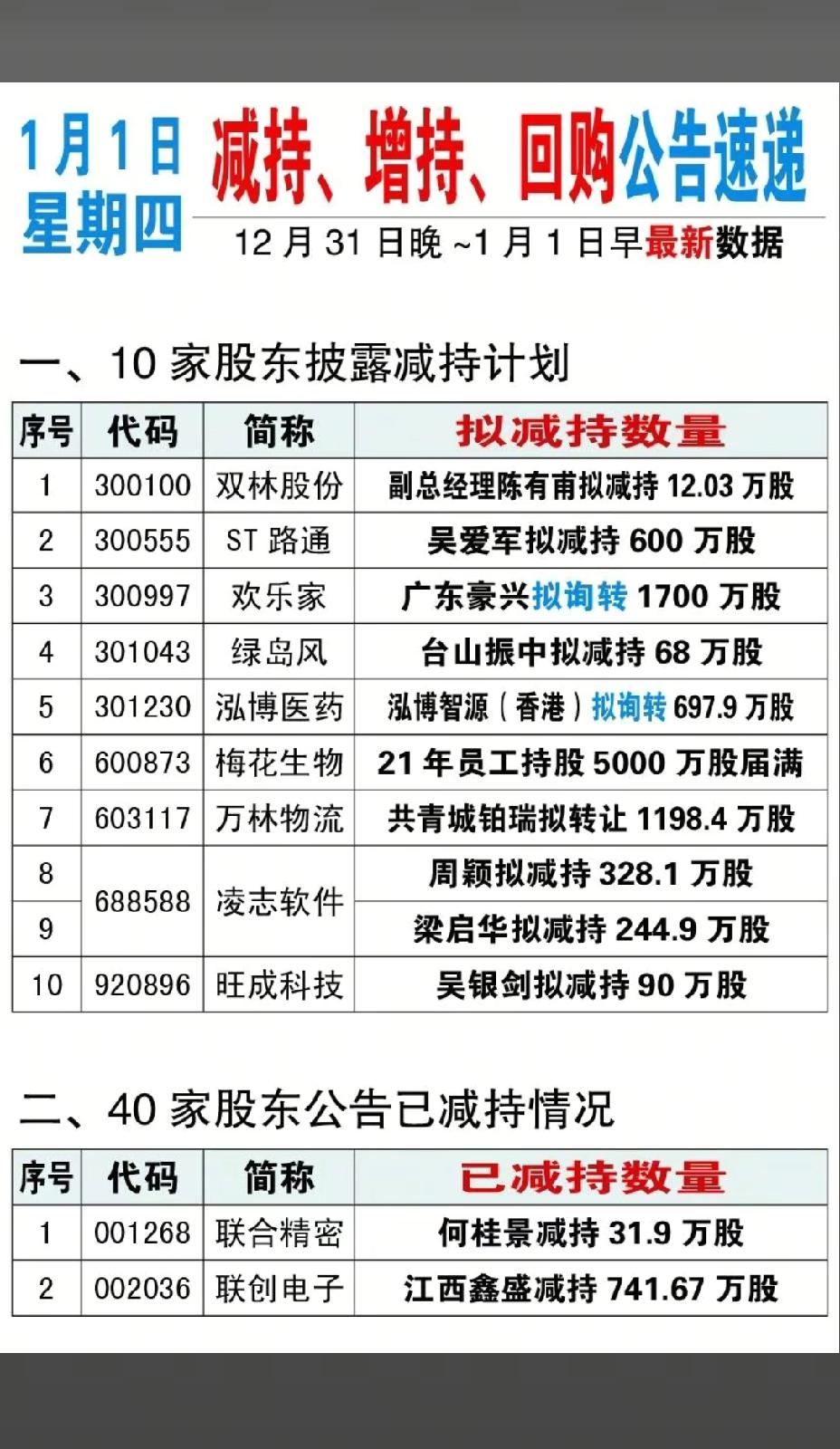 1月1日,节后A股这些股票有望大爆发!!! 10家公司披露减持计划,重点关注:广东豪兴拟询转欢乐家1700万股,后市需小心谨慎;共青城铂瑞拟转让万林物流1198.4万股,后市需注意风险;40家股东公告已减持情况;4家公司披露增持计划;重点关注:云南祥群拟增持健之佳5000万,后市值得高看一眼;5家公司披露回购计划;2家公司披露回购用途;13家公司披露已回购情况;2家公司公告注销回购股份!!!