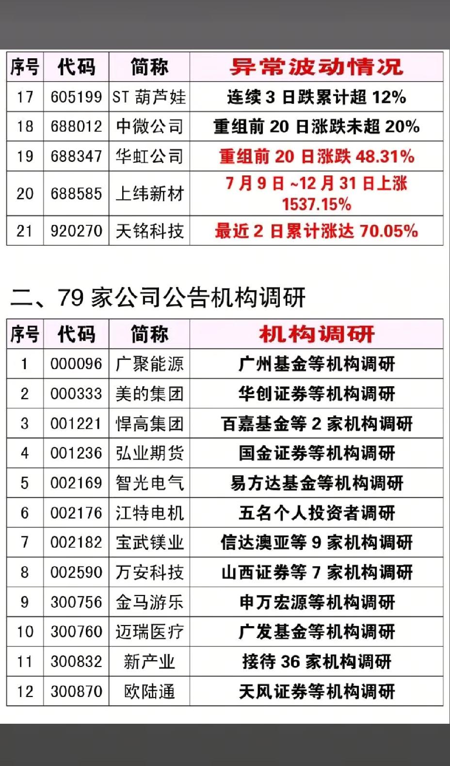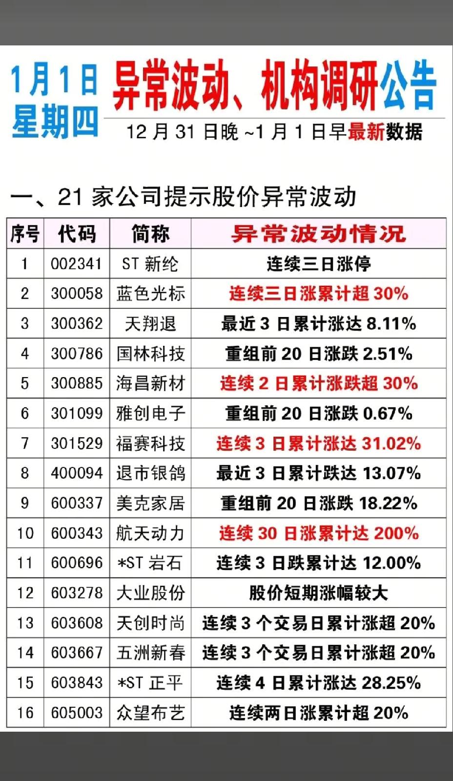 1月1日周四,节后A股这些股票需注意风险!!! 21家公司提示股价异常波动,重点关注:蓝色光标连续三日涨累计超30%,后市值得重点关注;福赛科技连续三日涨达31.02%,后市需注意风险;航天发展近30天涨幅达200%,后市能否延续强势,值得关注;79家公司公告机构调研!!!