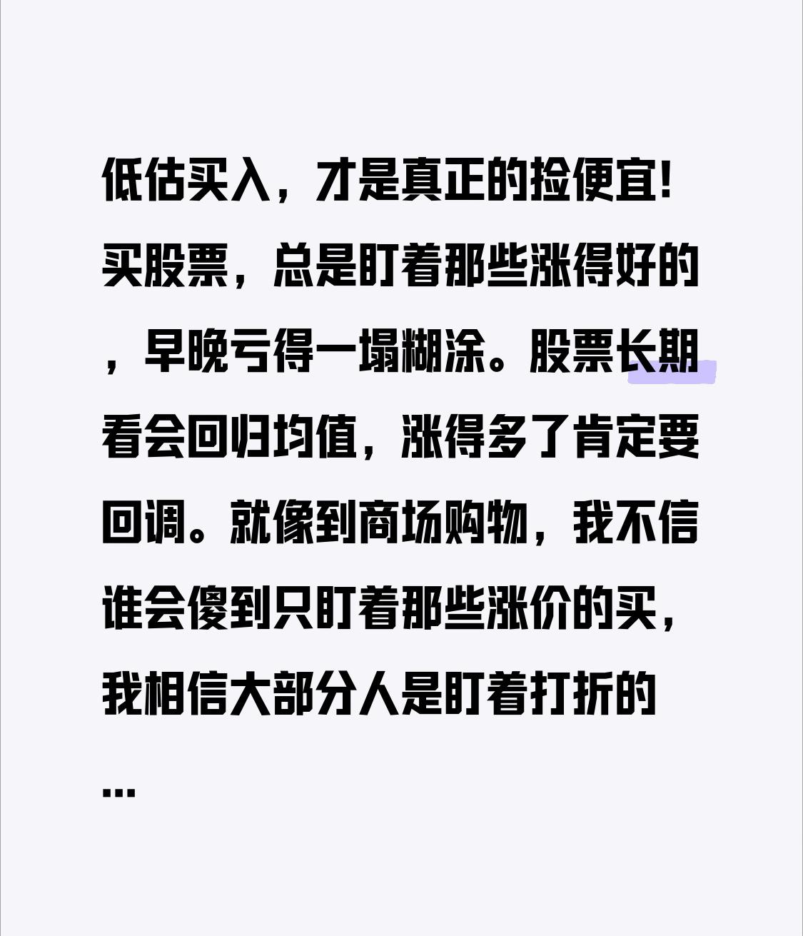 低估买入,才是真正的捡便宜! 买股票,总是盯着那些涨得好的,早晚亏得一塌糊涂。股票长期看会回归均值,涨得多了肯定要回调。 就像到商场购物,我不信谁会傻到只盯着那些涨价的买,我相信大部分人是盯着打折的买。否则,日子还过不过了。 看中了哪只股票,要耐心等。如果低估,也要等,看它会不会继续下跌,还是止跌企稳;如果高估,那就耐心等它回调。 有人问,那它一直不回调咋办?你见过太阳一直留在天上的情况吗? 只要耐心,一定能等到好价格。这就是捡便宜。