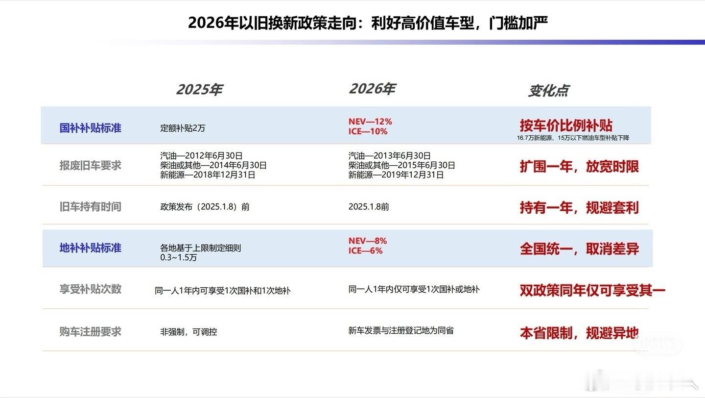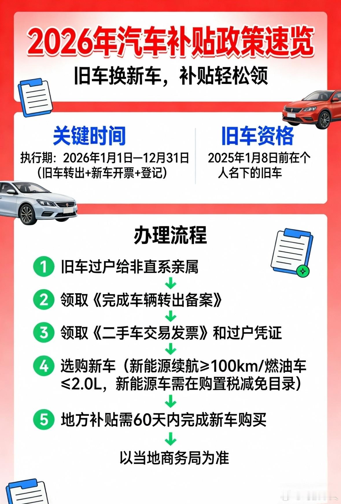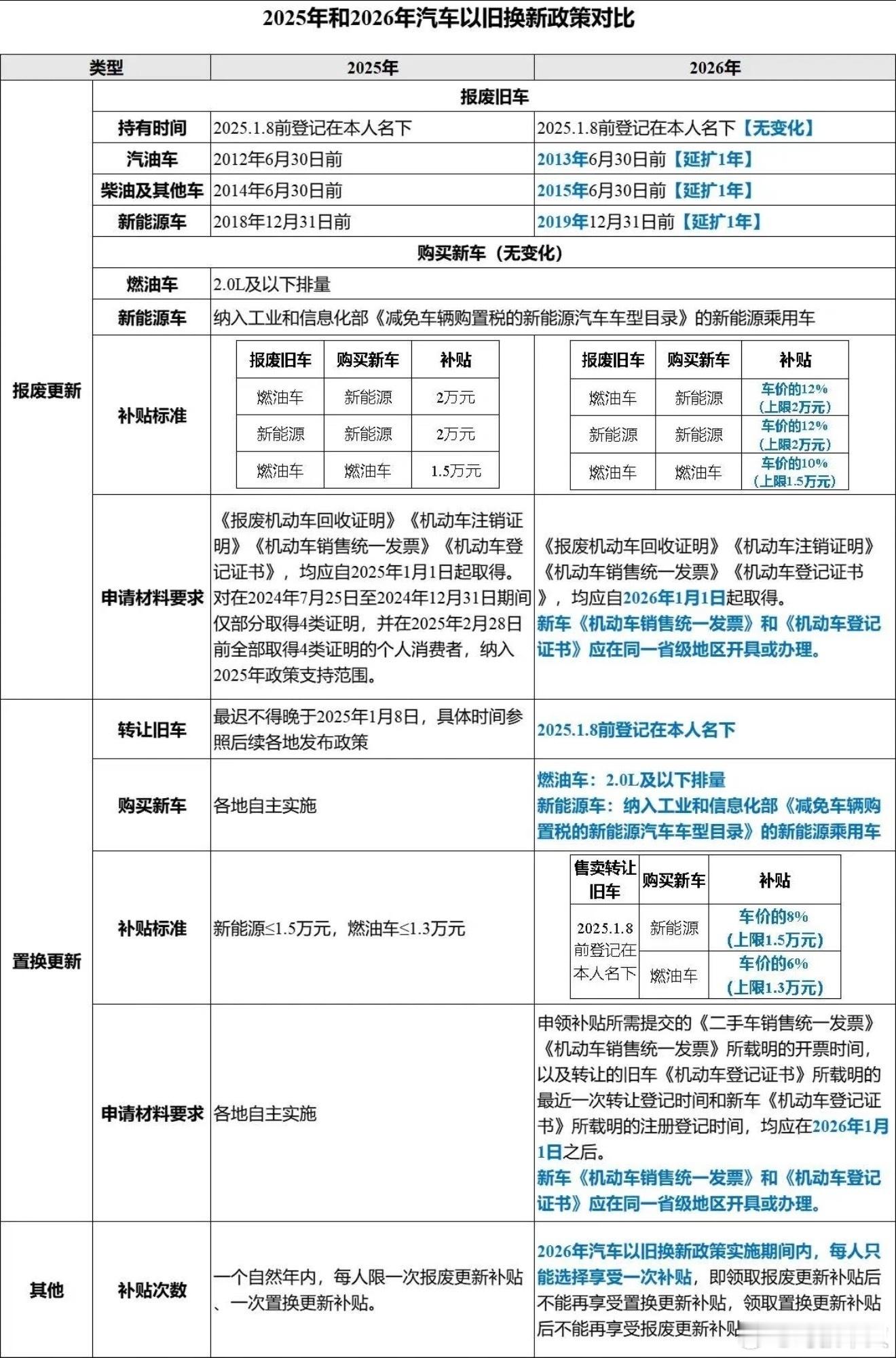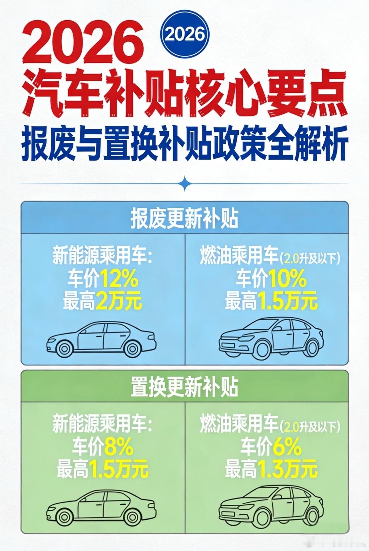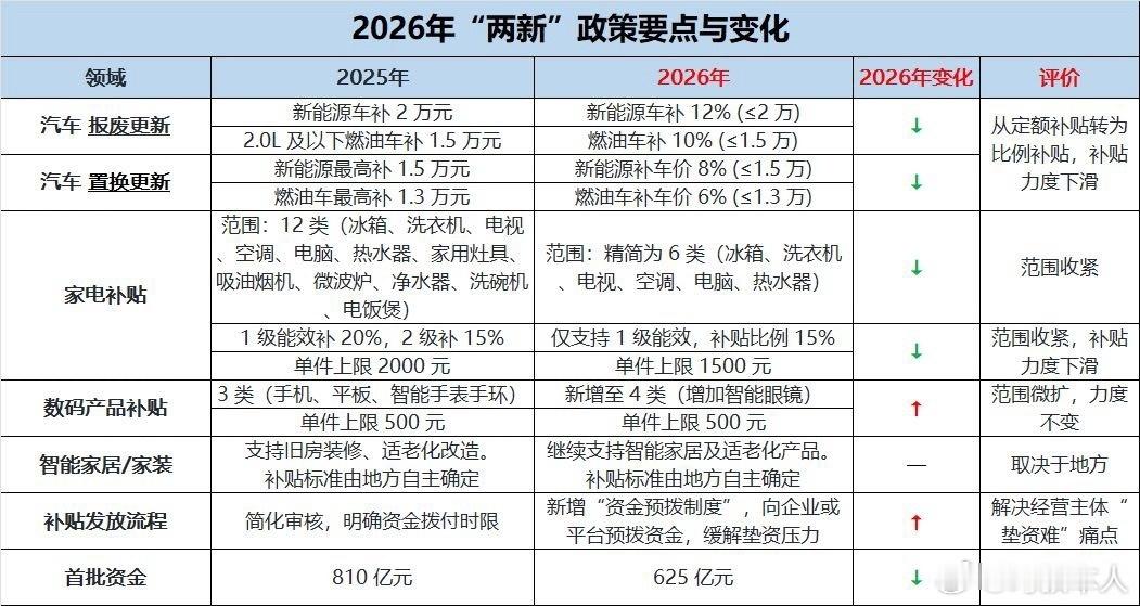 2026新国补来了对汽车来说变成比例计算了,高低价车型分化了!置换更新:新能源车补8%(封顶1.5万元),燃油车补6%(封顶1.3万元),旧车要求登记本人名下满1年且符合排放年限;报废更新:新能源车补车价12%(封顶2万元),需车价≥16.67万元才能拿满补贴。燃油车(2.0L及以下)补10%(封顶1.5万元)。低价车补贴缩水明显,例如10万元新能源车报废补贴仅1.2万元,较2025年减少40%。 家电品类缩减到只有冰箱、洗衣机、电视、空调、电脑、热水器6类可享补贴,不仅门槛提高了,只允许1级能效或水效产品享15%补贴,单件上限从2000元降至1500元,每类限购1件,还取消了厨电等品类;但是新增了智能眼镜,与手机、平板、智能手表/手环并列为4类补贴品,单件≤6000元补15%封顶500元。 首批625亿资金,覆盖汽车、家电、数码三大领域……2026第一批625亿以旧换新资金已下达汽车新能源汽车汽车资讯