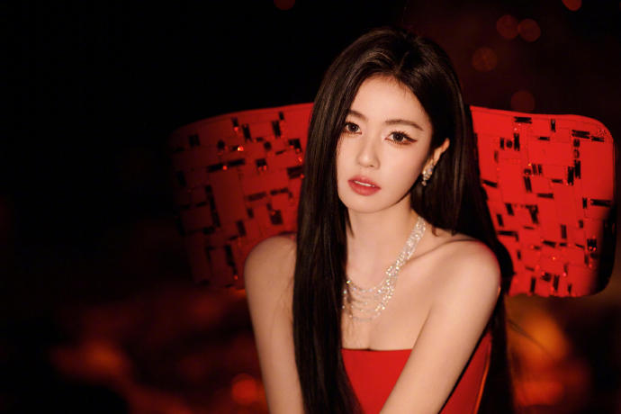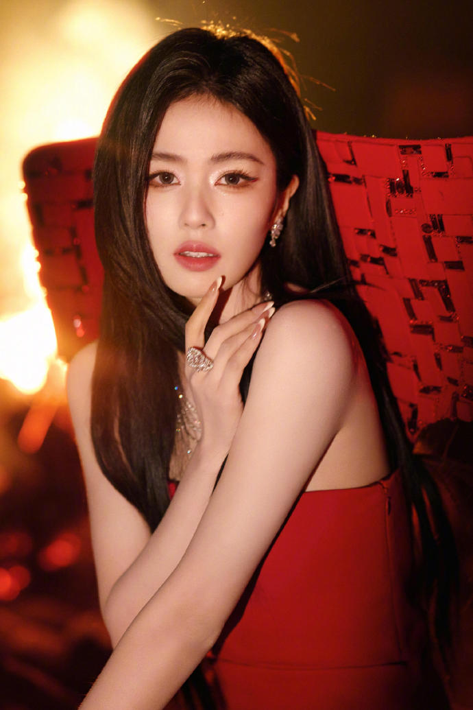 白鹿元旦写真造型,Stéphane Rolland正红抹胸高定裙搭几何感红色背饰,DeBeers珠宝衬出精致贵气,篝火暖光背景的热烈氛围,把优雅线条与张扬设计结合的完美,红火开年的明媚感直接拉满。