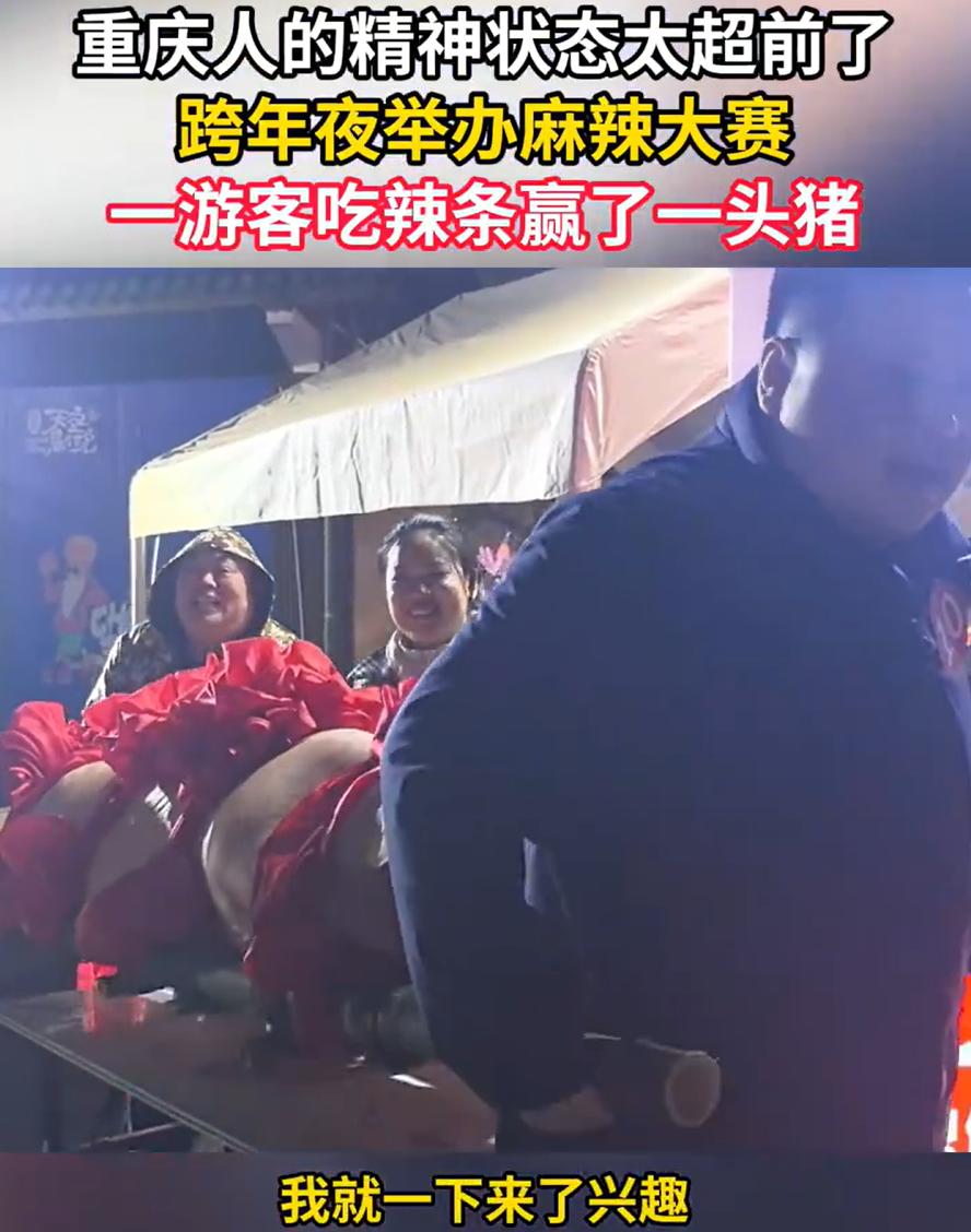 这下赚麻了!重庆,一景区跨年举办吃辣大赛,不过让人意外的是,获得冠军的是一名新疆游客,这也让他赢下一头300斤的年猪,网友:过年都不用买肉了! 比赛安排得挺有意思,从重庆本地的石柱红、子弹头辣椒开始,到裹满红油的麻辣蛋糕,还有爆辣的辣条,一层比一层辣。选手们吃得满脸通红,汗直往下淌,有的人嘴巴都辣歪了,手却还停不下来,继续往嘴里送。围观的人一边觉得过瘾,一边也跟着流口水,有人喊着看馋了,也有人跃跃欲试想上台 就在这种本地高手云集的场面里,一位新疆大哥不声不响地吃了全程。他辣得额头冒汗,但节奏一点没乱,一口接一口,到最后竟然以明显优势赢了。现场估计很多人都没想到,在重庆比吃辣,让一个外地人拿了冠军 奖品那头三百斤的年猪,被工作人员牵上来的时候,围观的人都哇了一声。活生生一头猪,就这么被大哥用嘴赢走了。有人说这是最硬核的跨年礼物,比年终奖还实在,回家过年桌上肯定丰盛 一般人总觉得,吃辣大赛在重庆办,那冠军多半是本地人,毕竟这儿是辣味的大本营。但结果偏偏是一位新疆游客赢了。这倒打破了那种刻板印象,好像什么地方的人就一定擅长什么。美食、吃辣这种事,本来就没有绝对的地域界限,喜欢的人、能扛得住的人,可能来自任何地方 而且现在很多人过节喜欢搞点不一样的活动,这种比赛虽然看起来简单,但气氛热烈,参与感强,比单纯看看演出凑凑热闹有意思。赢了有实在的奖品,输了也是一段热闹的经历,大家图个开心,跨年也跨得印象深刻