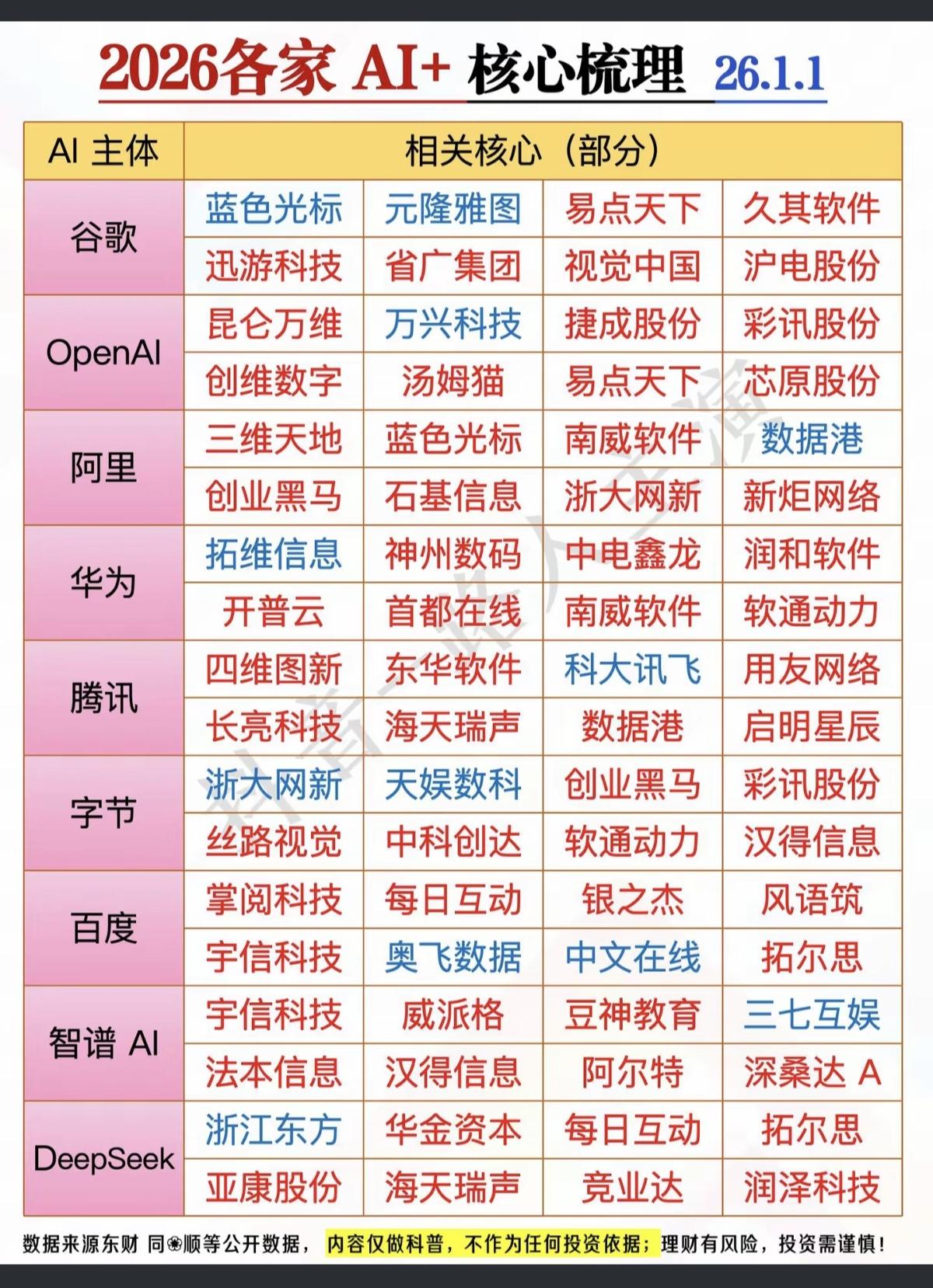 2026年:各家AI龙头股代表 梳理! 谷歌,OpenAI,阿里,华为各家都有各自的代表。aI将改变人类认知