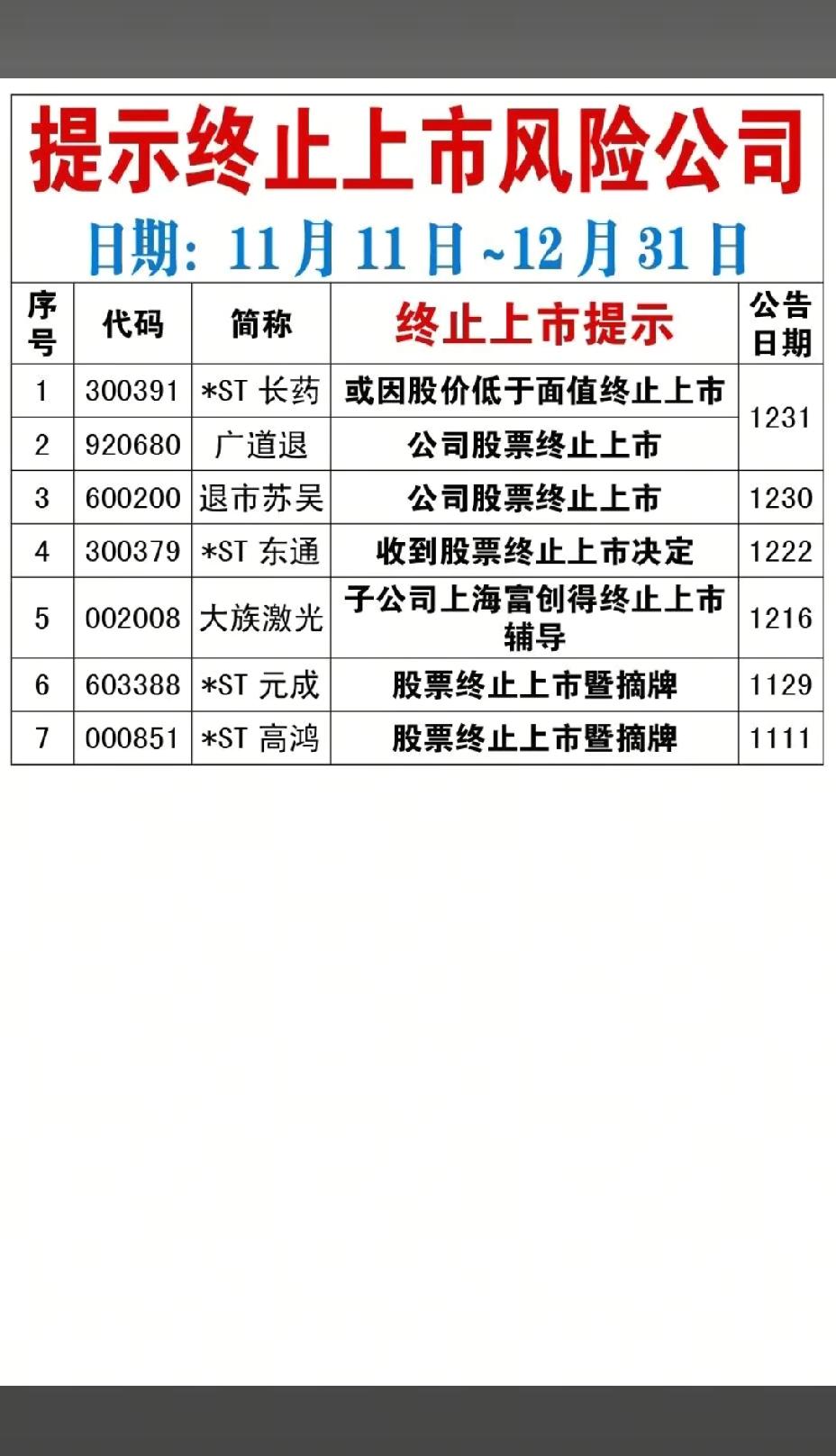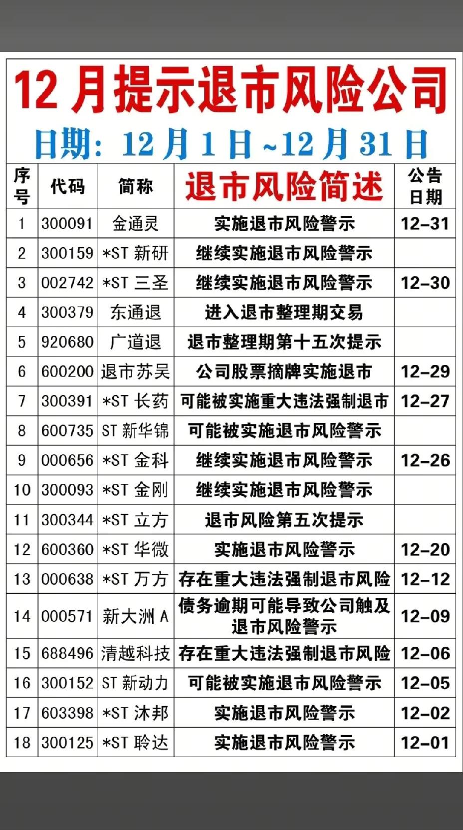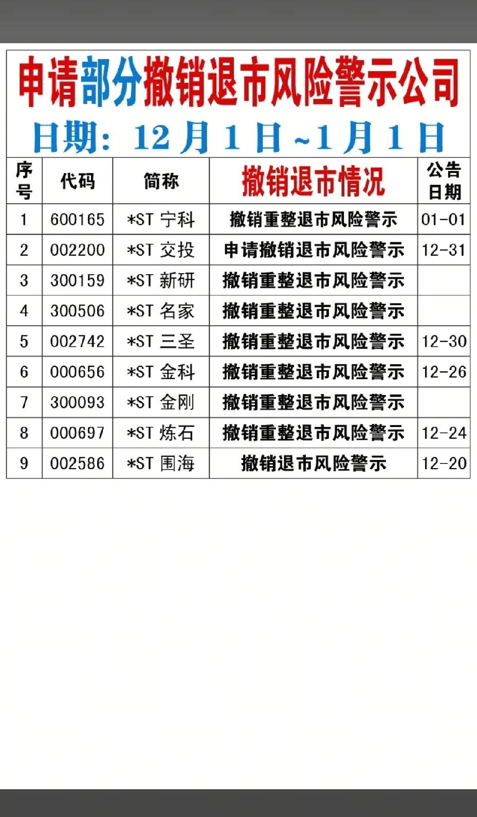 1月1日,节后A股这些股票需注意风险!!! 18家公司提示退市风险,重点关注:金通灵实施退市风险警示,后市需注意风险;9家公司申请撤销退市风险警示;7家公司提示终止上市风险,重点关注:大族激光子公司上海富创得终止上市辅导,后市注意风险!!!