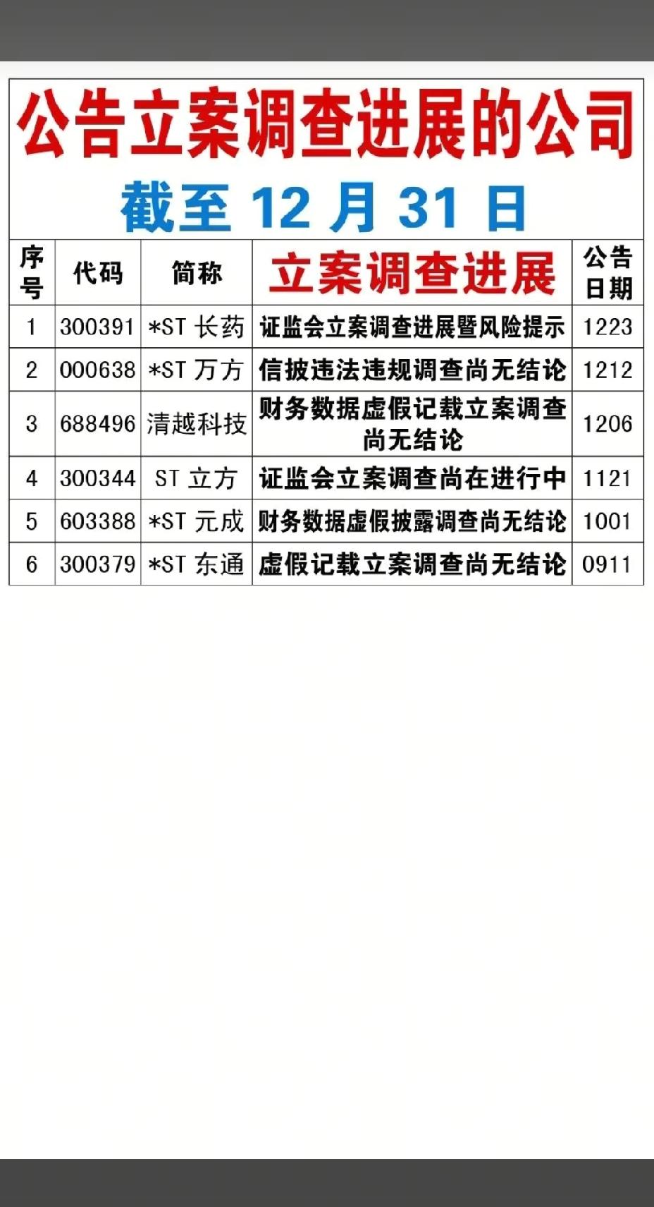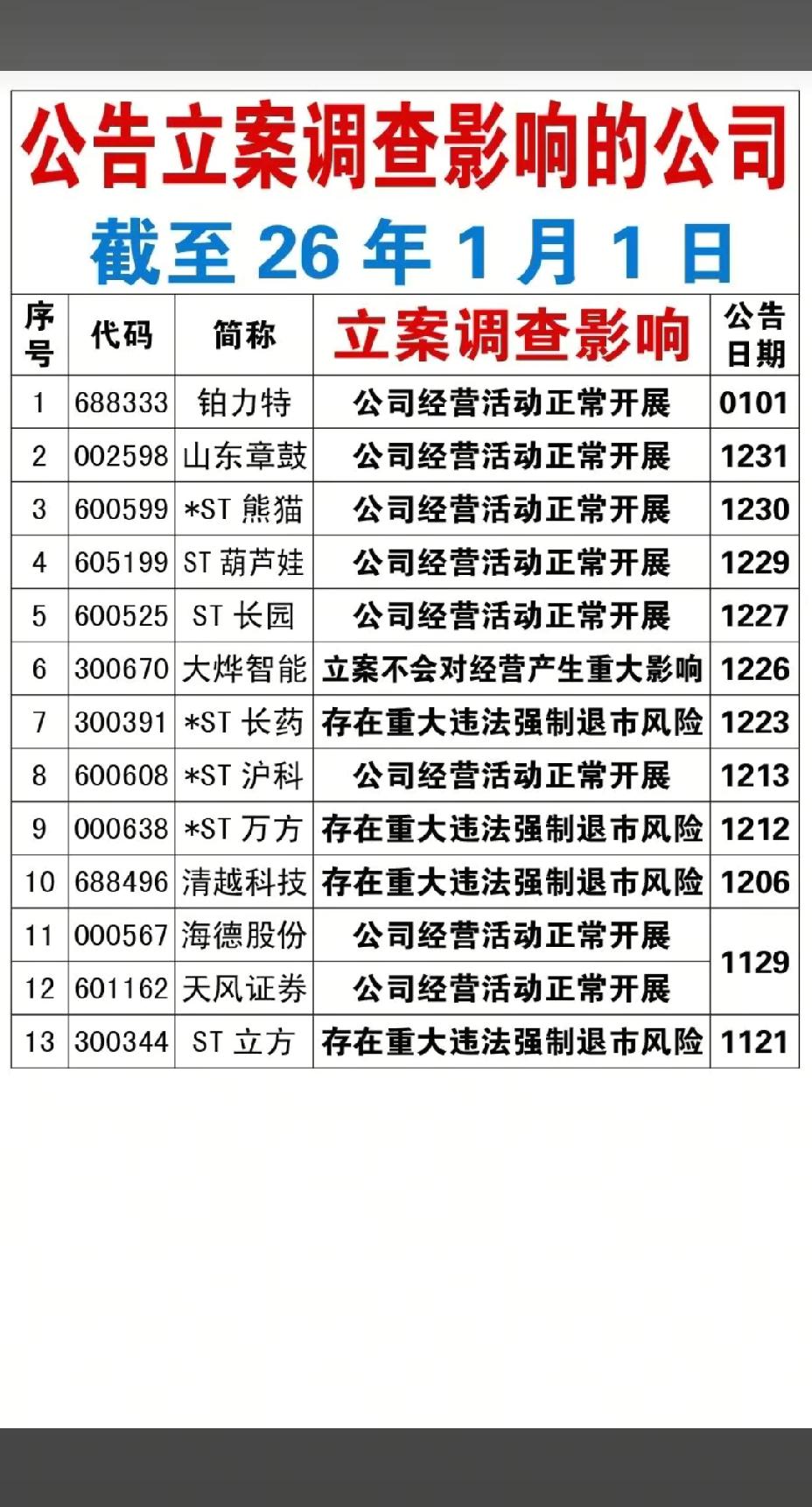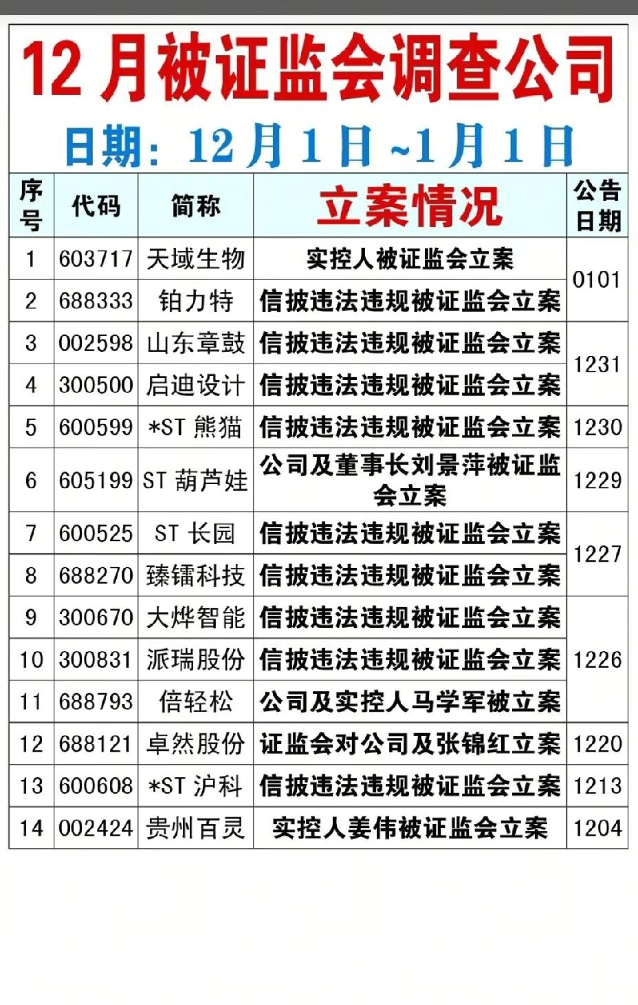 1月1日,节后A股这些股票要远离!!! 14家公司被证监会调查,重点关注:铂力特信披违规被立案,后市需注意风险;臻镭科技因信披违法违规被立案调查,后市需小心谨慎操作;倍轻松公司实控人被立案调查,后市需注意风险!!!