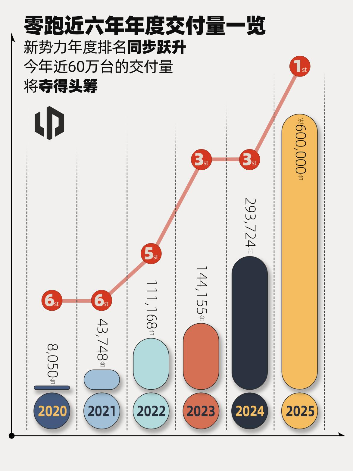 零跑12月销量出炉,首次夺得新势力年度销冠! 年终岁末,25年中国造车新势力销量竞赛正式落下帷幕,零跑汽车凭借亮眼表现交出重磅答卷,零跑12月交付达到60423辆,凭此零跑25年全年累计交付近60万台,成功斩获新势力年度销冠,并创下了新势力年销新纪录,标志着零跑已实现从行业追随者到领跑者的关键跨越。 其实通过日前零跑十周年发布会上朱江明的回顾,我们不难得知,零跑能够取得如今的成就,首先离不开多方助力,对此朱江明在发布会上更是说了多达22次谢谢,来深切感谢这十年期间给零跑提供帮助的同路人和120万用户;二是得益于零跑坚持全域自研所拥有的体系化能力,让旗下车型凭借着好而不贵的优势,做到了款款皆爆款的热销表现。 而在发布会上惊艳亮相的零跑D19、零跑D99这双旗舰车型,就可以说是零跑全域自研十年技术的集大成之作,凭借着30万级价格百万级价值体验的表现,直接拉满了期待值,很大程度上会上市就热销。很显然在坚持全域自研+好而不贵理念,以及产品阵营不断完善的情况下,零跑今年的销量成绩肯定还会更上一层楼,冲击百万销量真不是没可能。