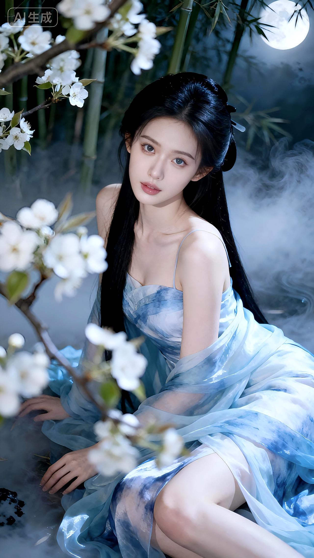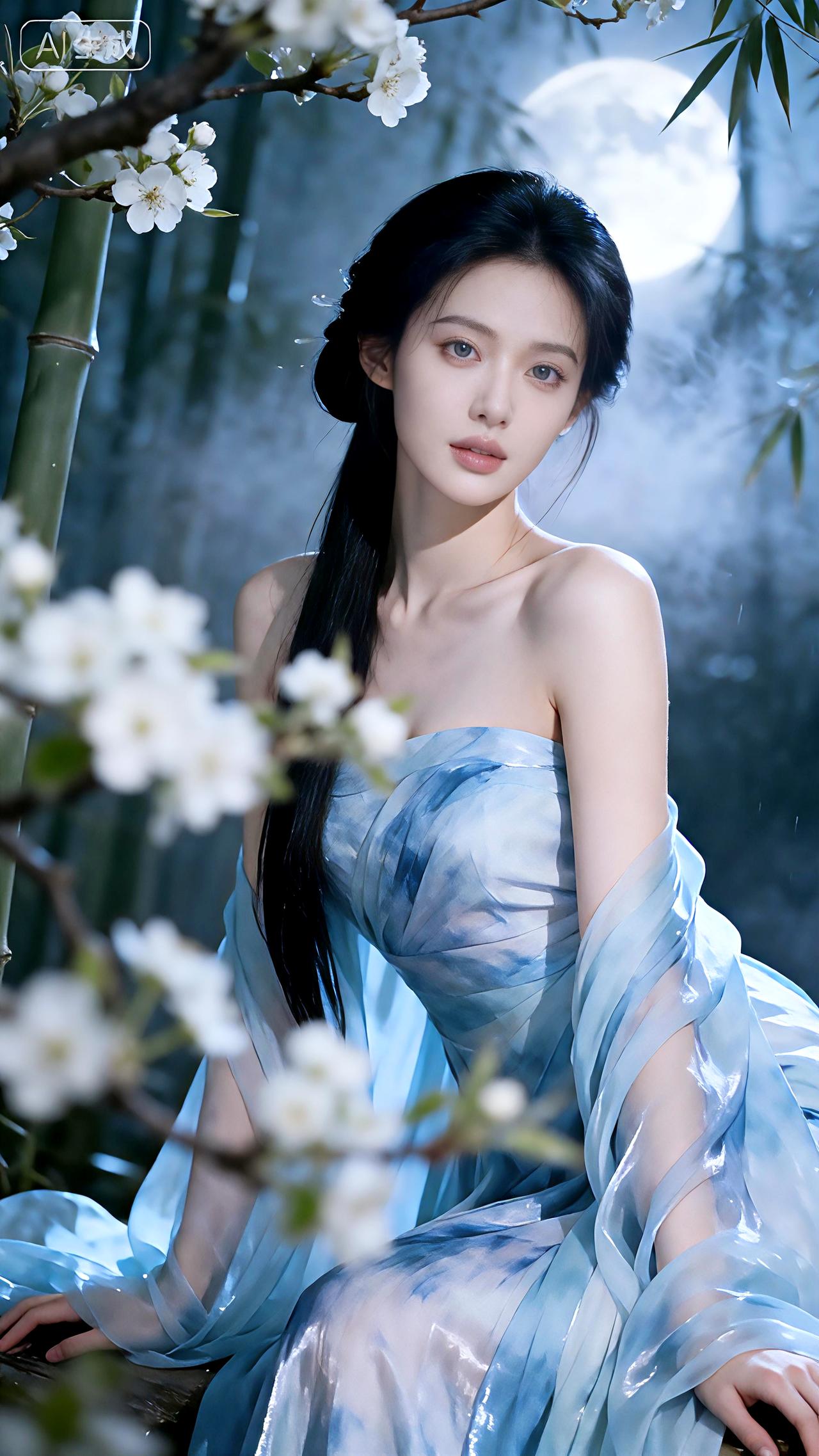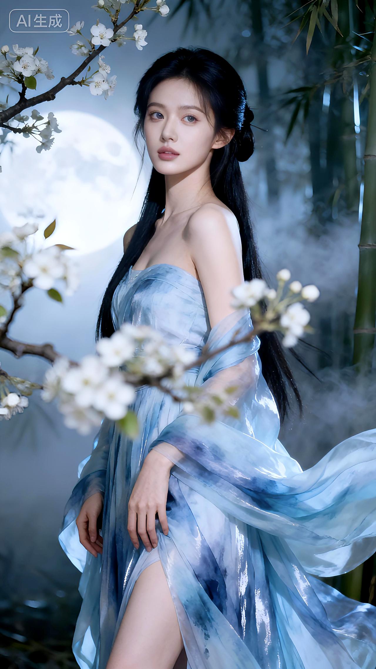 月下梨花映冰肌,竹影拂裳清露凝。