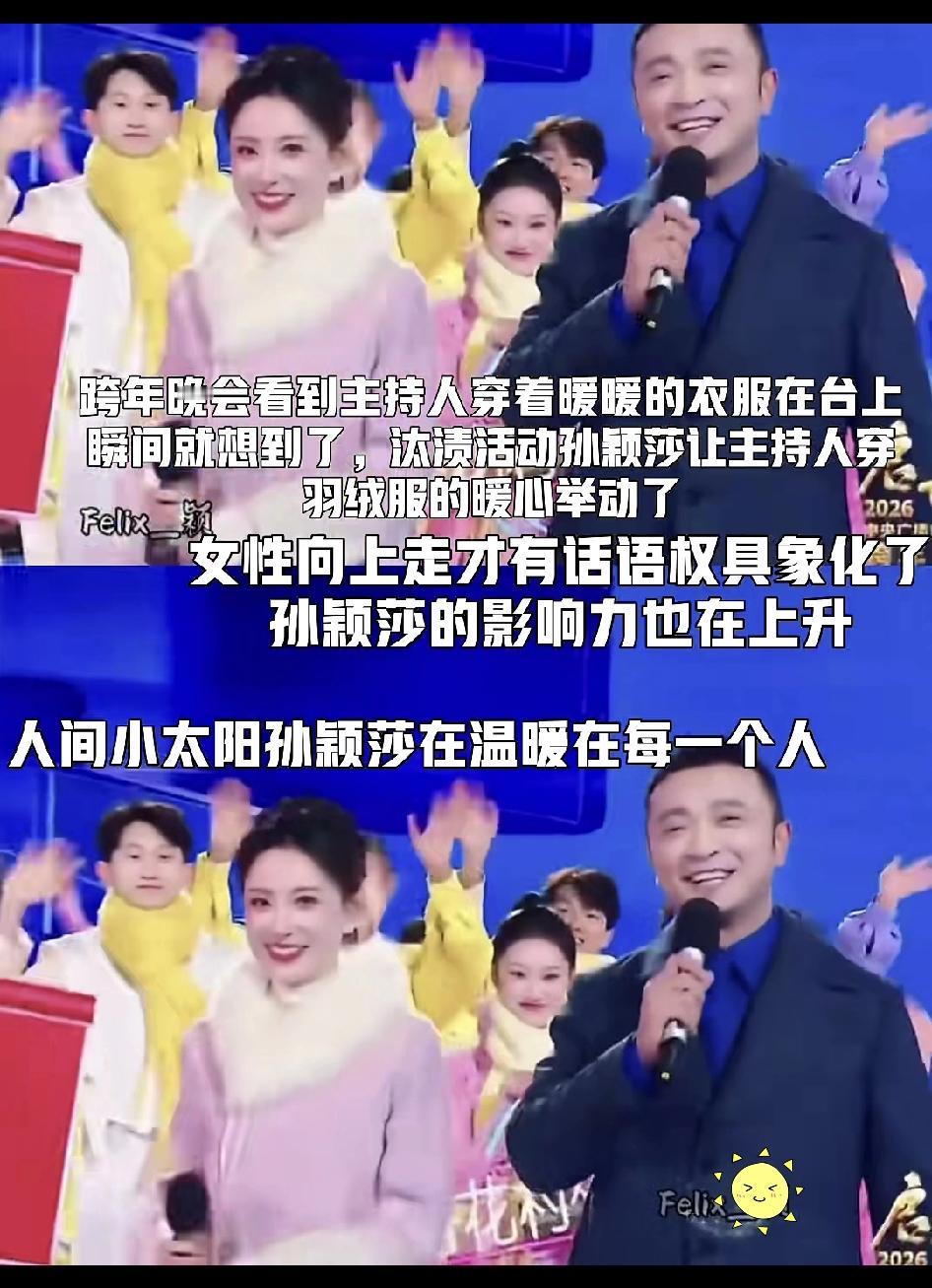 孙颖莎新时代女性的骄傲! 今年央视的跨年晚会,有一个特别的细节,所有的主持人、演员和伴舞都穿得厚厚实实的,显得特别暖和,这在往年是不可想象的,往年不论多冷,主持人和演员们都是夏装打扮,尤其是女主持人和女演员,礼服都是露胳膊露腿的。 今年之所以会有如此大的变化,是因为孙颖莎,在她代言的品牌见面会上,她提议让主持人穿着羽绒服上台。这个提议被采纳了,并且成功地改变了央视跨年晚会几十年的传统。 由此我也想到,寒冷的冬天里,演员们上台表演,不如也穿着厚实实的衣服,既保暖又得体,要是春晚也能借鉴这一做法,那就更好了。