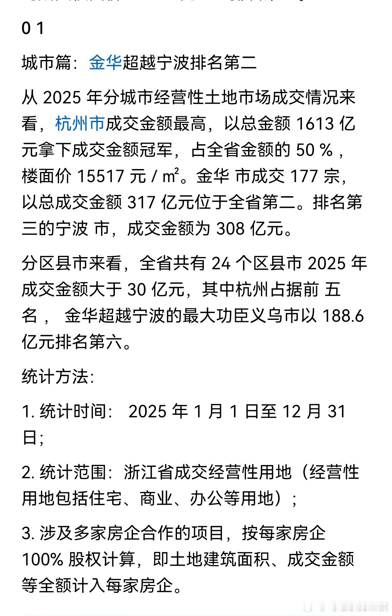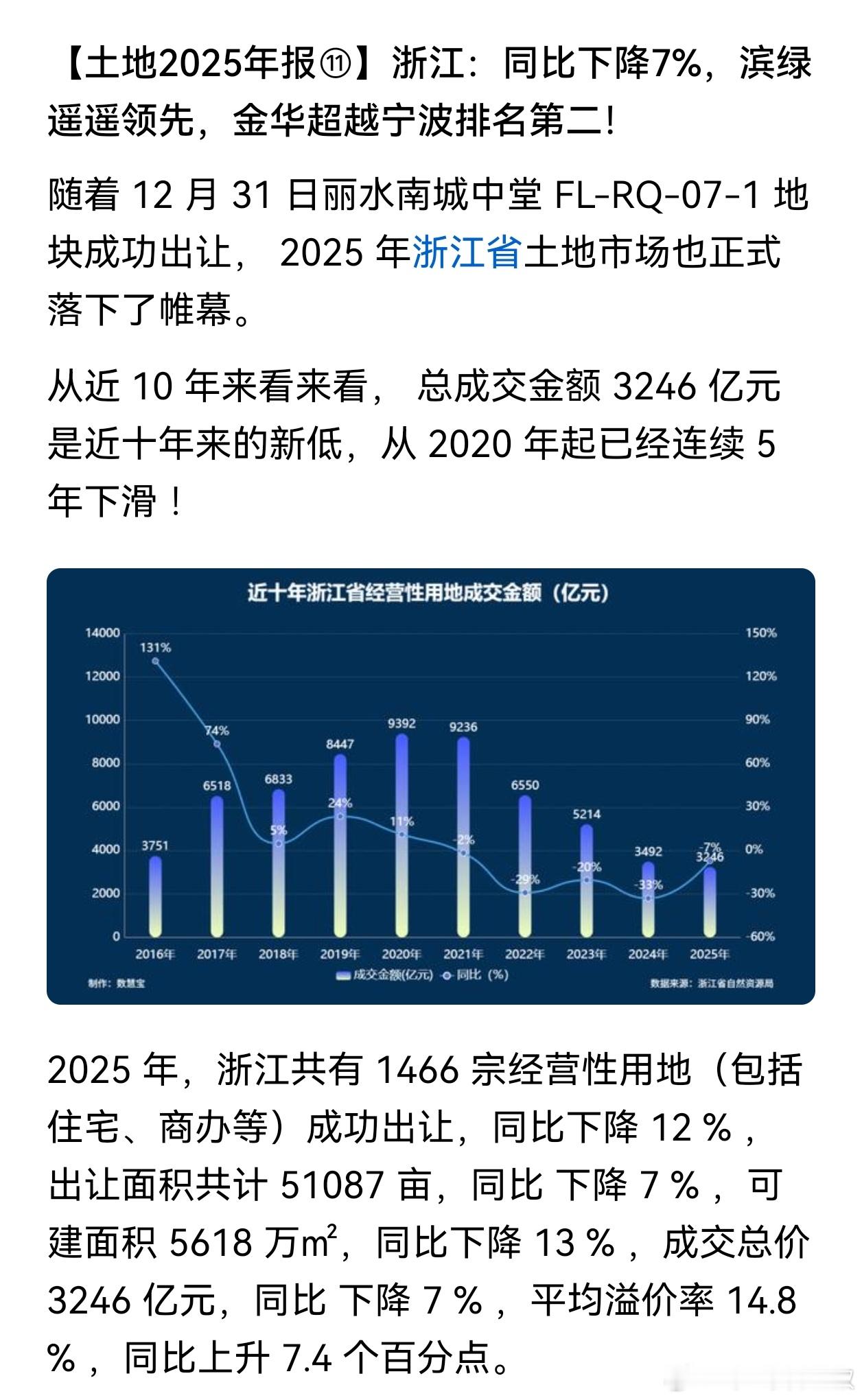 2025年,浙江共有 1466 宗经营性用地(包括住宅、商办等)成功出让,总成交金额 3246 亿元 是近十年来新低,比2016年都低了。金华市成交 177 宗,总成交金额 317 亿元位于全省第二。主要贡献是义乌市的188.6 亿元。排名第三的宁波市,成交金额为 308 亿元。杭州1613亿,遥遥领先。其实,浙江各地市县的城市边界也基本确定了。剩下是填充题。