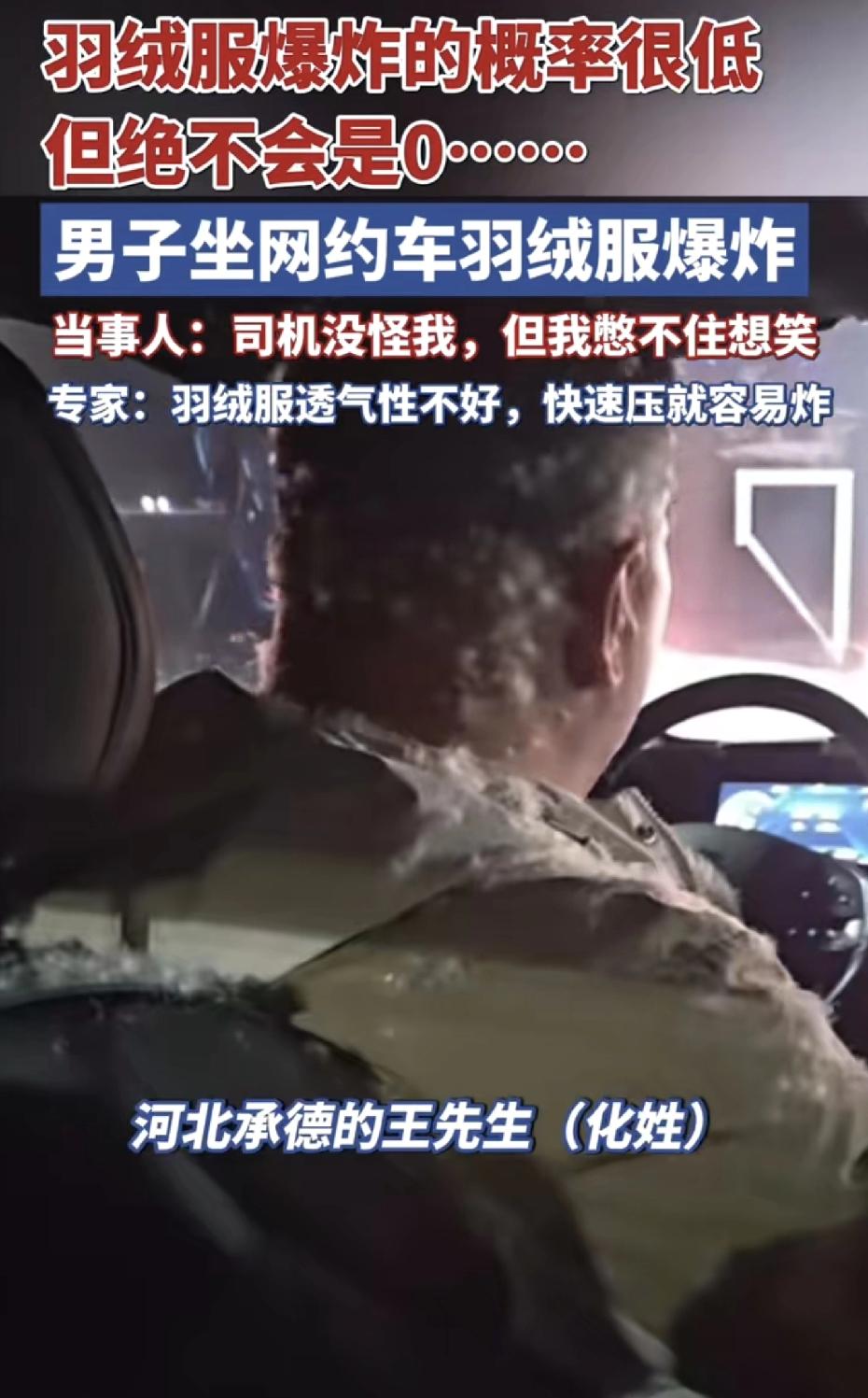 解释不清了!河北一男子坐网约车,不料身上穿的羽绒服突然爆炸,司机头上毛衣上全是羽绒。男子说:司机没怪我,但是我憋不住想笑! (河北的一个早上,一男子跟咱很多人一样,着急忙慌地赶着去上班,伸手打了辆网约车。他拉开车门,一屁股坐进后座——估计脑子里还想着今天的工作,或者庆幸自己没迟到。 可谁都没想到,他刚坐下,身上那件厚厚的羽绒服,毫无征兆地“嘭”了一声,直接“炸”了。 不是着火那种炸,是字面意思上的爆炸。一瞬间,成千上万的白色羽绒从衣服里喷涌而出,像在车里制造了一场迷你暴风雪。 座椅上、脚垫上、车窗上,目光所及全是毛茸茸的一片。 这还没完,前排开车的司机师傅更是遭了“无妄之灾”:他的头上、脖子上、肩膀上,全沾满了羽绒! 那场面,你能想象吗?原本安静的车厢,突然被羽绒填满,两个人估计都懵了。 坐在后座的男子自己也愣住了,可看着这荒唐又无法收拾的场面,他实在没憋住,在后座笑出了声。一边笑,一边赶紧跟司机师傅道歉。司机也挺无奈,但好在从头到尾都没开口责怪他。 车总得下,烂摊子也得收拾。下车的时候,男子主动赔了司机几十块钱,当作清理车子的费用。事后他说,其实那件羽绒服质量不差,喷出那么多羽绒,衣服本身才破了一个小角。有网友还苦中作乐地调侃:“往好处想,这充绒量是真实在,真货!” 我真有点心疼和佩服那位司机师傅,大冬天的清晨出车,本来就不容易,结果无缘无故来了这么一出“天降羽绒”。 车里弄得一塌糊涂,后续清洗肯定特别麻烦,绒毛那东西无孔不入,耽误的时间更是没法算。 人家没发火,真的是脾气好、有职业素养。将心比心,要是咱自己的车被弄成这样,能不能心平气和还真不好说。 如果你是这位司机会生气吗?