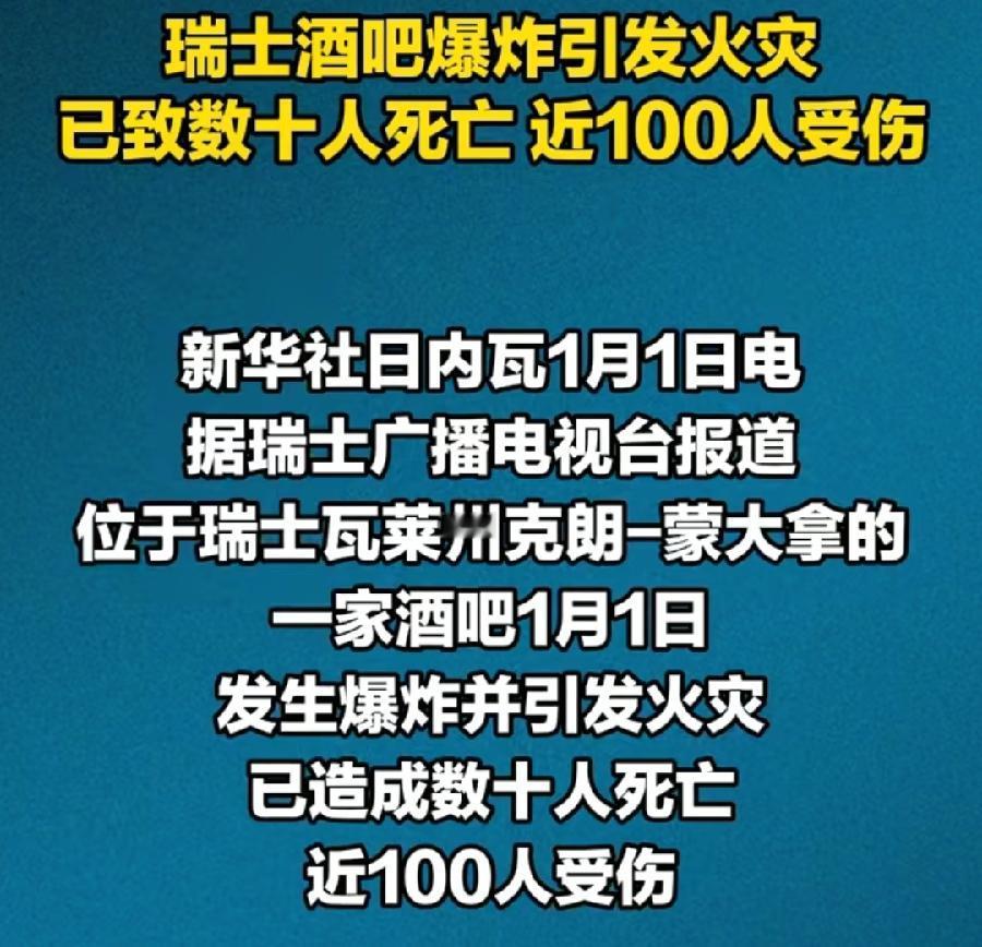 瑞士跨年夜爆炸10死100伤,可见中国禁燃禁放政策多么正确!初步认为烟花存储不当引起,烟花没放成,跨年庆祝没庆成,造成这么大死伤!跨年几秒钟的仪式感,与生命相比,哪个重要?国内禁燃禁放,虽然大多数人支持,可还是有少部分人不理解,特别不成熟的小年轻们,年可以不跨,命没了,啥都没了!