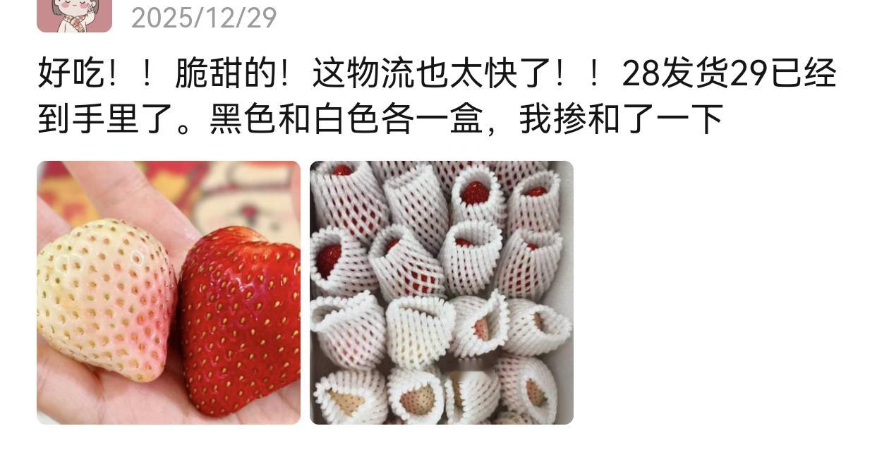 高端品种,别人即将售罄的多色盲盒2.6斤288我们只要149....到手3.2斤非礼盒装(0.2斤是为了抵扣损耗赔付的哈!)然后老板元旦不放假!我监督他吭哧吭哧给大家发草莓哦!!黑白配和纯白的芊雪都还能发出来因为黑越王暂时管够!去年没吃到超好吃黑草莓的可以冲啦!!基本买了黑白配的都马不停蹄又多下一单可能怕黑草莓没了配不了货~是顶配的草莓味道!【图12保存到相册里,用绿色聊天软件扫一扫打开即可参団!】