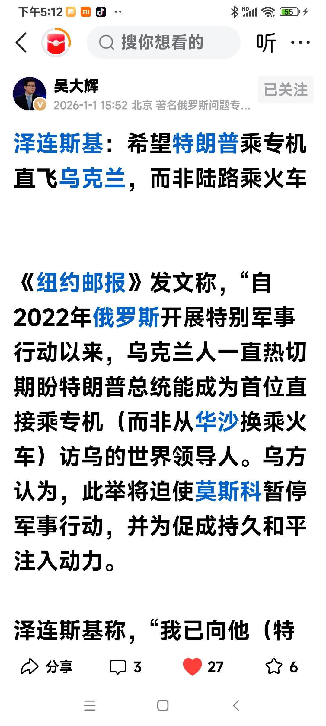 特朗普或乘专机访问乌克兰 我国著名的俄罗斯问题专家,清华大学国际关系学系教授吴大辉现在刚刚发表了一篇文章:《泽连斯基:希望特朗普乘专机直飞乌克兰,而非陆路乘火车》,乌克兰人希望特朗普能打破这一僵局,直接从空中抵达乌克兰访问。 吴大辉教授的文章说《纽约邮报》发文称,“自2022年俄罗斯开展特别军事行动以来,乌克兰人一直热切期盼特朗普总统能成为首位直接乘专机,而不是从华沙换乘火车访乌的世界领导人。乌方认为此举将使莫斯科暂停军事行动,并为促成持久和平注入动力。 ——泽连斯基称“我已向特朗普表示,我们将诚挚欢迎其到访。”泽连斯基还提议,特朗普可搭乘直飞航班前往基辅……乌方寄望于这场高调的访问,能够令俄罗斯在美军最高统帅访乌期间难以继续发动袭击,并助力这场持续近四年的冲突走向终结。 说实话,这对于一直致力于乌克兰战争和平进程的特朗普来说确实是一个不错的主意,一个非常好的主意,这个办法什么都不需要投入,只要俄罗斯和乌克兰双方在一段时间内不向空中发射无人机和巡航导弹就行了,这对于无论哪一方来说应该都不是一件很难的事情,而且特朗普期待的停火可以在瞬间就能实现,特朗普应该非常愿意做这样的尝试。 我们常说千里之行,始于足下,虽然特朗普到现在还未能兑现竞选时提出的24小时的结束乌克兰战争的承诺,但让战场实现24小时的停火特朗普是完全可以做到的,而且任何人都不会拒绝这位和平使者。 我们知道特朗普总统是一位意志非常坚定,执行力也是非常强大勇敢的人,果断的乘坐飞机抵达乌克兰访问或许就是他一念之间的事情,而让乌克兰战场实现几年来的首次停火更是一场功德无量的壮举。
