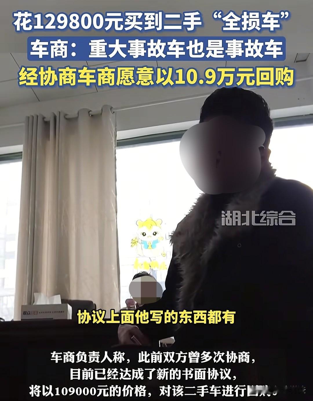 “大冤种!”湖北武汉,男子花129800元买一辆二手2023款蔚来车,签合同时,销售在上面加了一个事故车,却告诉男子就是小追尾,不料,男子的车开了不到一个月,车坏了,送到4S店检修,被告知这是重大事故车,属于“全损车”,理赔高达93000元,已经没有任何维修的价值了,男子气愤去找二手车行,对方却说:重大事故车,它也是事故车,合同也写了事故车,可以回购。最终协商结果,还是男子吃了亏! 2025年10月份,金先生想买一辆二手车,他通过网络在武汉的某一家二手车店看中了一辆2023款的蔚来汽车。 销售介绍说,这款汽车,行驶里程4万多公里,价格是129800元,无火烧,无水泡…… 金先生一看还挺满意的,就同意买下这辆车。 2025年10月27日,金先生和二手车店签了合同。 据金先生回忆说,“他写完合同后,就在上面加了一个事故车,销售当时说就是一点小碰撞,车前面有个小追尾,很小的一个事故。” 金先生当时信以为真,真的以为是个小事故,就稀里糊涂的付了钱,办了贷款,将车买了下来。 可他怎么也没想到,就因为他当时没有“计较”,买下车后可给他坑苦了。 买下车之后,金先生开了不到一个月,行车雷达故障灯一直亮着,车坏了! 金先生的家人赶忙将车送到4S店检修,这一检修不要紧,才发现这车买的亏大了, 4S店告诉金先生,你这辆车是全损车,也就是重大事故车,理赔金额高达93000元,这辆车已经没有任何维修价值了。 金先生一听就傻了,自己花钱买了一辆二手“全损车”,那二手车行可给自己坑了。 4S店工作人员和金先生说,车碰的挺严重的,前头撞的比较严重,车内气囊已经爆开了,用的配件也是拆车件,另外,原来是黑色的车,用的是灰色的旧杠。 金先生是又气愤又苦恼,他说,二手车告知事故车时,已经办完了贷款,对于销售的说法,金先生觉得他就是在混淆小事故和重大事故。 也就是说,金先生当时买车时以为销售说的是小事故,可事实金先生购买的车是重大事故车。 此事中,二手车店在销售时,将实际是重大事故车的情况,轻描淡写地描述成“一点小碰撞、小事故”,这种行为明显没有真实、全面地向金先生提供车辆的真实信息,属于作虚假宣传。 金先生正是因为受到这种虚假信息的误导,才在违背自己真实意愿的情况下购买了车辆。 所以,二手车店的行为构成欺诈。 《消费者权益保护法》第55条规定:经营者提供商品或者服务有欺诈行为的,应当按照消费者的要求增加赔偿其受到的损失,增加赔偿的金额为消费者购买商品的价款或者接受服务的费用的三倍;增加赔偿的金额不足五百元的,为五百元。 金先生有权请求人民法院或者仲裁机构撤销这份购车合同。 一旦合同被撤销,就意味着这份合同自始没有法律约束力,金先生可以要求二手车店返还购车款,同时自己也要归还车辆。 而且,如果符合相关条件,金先生还可以依据《消费者权益保护法》要求二手车店进行三倍赔偿。 为了维护自己的权益,金先生只好找了记者一起来到当初买车的二手车店里。 记者问车行负责人,重大事故车和事故车是不是有区别呢? 对方表示,重大事故车它也是事故车,合同上已经给你写了事故车,那如果你觉得这个有疑问,你当场应该提出来为什么要写事故车这几个字? 车行负责人这一番话,给金先生整的挺无语。 而且,车行负责人说,在此前,他们和金先生多次协商,说可以把车回购,而且,目前已经达成了新的书面协议。 说完,负责人把一张手写的书面协议递给了记者看。 协议中表明,车行将以109000元,对金先生购买的二手车回购,而金先生当时也表示认可。 金先生说,他一直认可,接下来他回去准备钱去银行解押,估计要15个工作日之内,就可以把这件事全部处理好。 很明显,金先生当初签合同时,对于对方在合同中加“事故车”一事没有提高警惕,最终,吃了亏。 有人说,这本身就是套路,说得模糊,然后加上事故车,又让你签合同,一去一回,赚2万。 妥妥大冤种,转手亏两万,还有贷款的利息,提前还款还有违约金,算下来保守亏3万。 这个价格一看就是有问题的,买二手车只要记住一点,你不贪便宜,不挑那个最便宜的买就没问题。 人家合同写明无泡水无火烧,而且备注事故车。这种起诉没有任何意义,车行陪你玩,只能找记者,只能说吃一线长一智。 也有网友说,买二手车有修理工的朋友带去看车,没有的话花200块钱雇他一天去给你看车,比你自己踩坑强多了。我是修理工,而且我是修大车的,我朋友看上一辆车,他让我去给他看看有没有事故,二手贩子说没有事故,我去了打开前机盖,后备箱,看了看玻璃,发动了车试了一下,我就和我朋友说回去吧,别的什么也没说,结果这辆车前后都撞过,发动机还有故障码。我和我朋友全说了,我朋友说幸亏带你去了,不然就被坑了。 其实,这个办法挺好,找个懂行的人看看,避免吃亏上当,签合同时也要谨慎在谨慎。