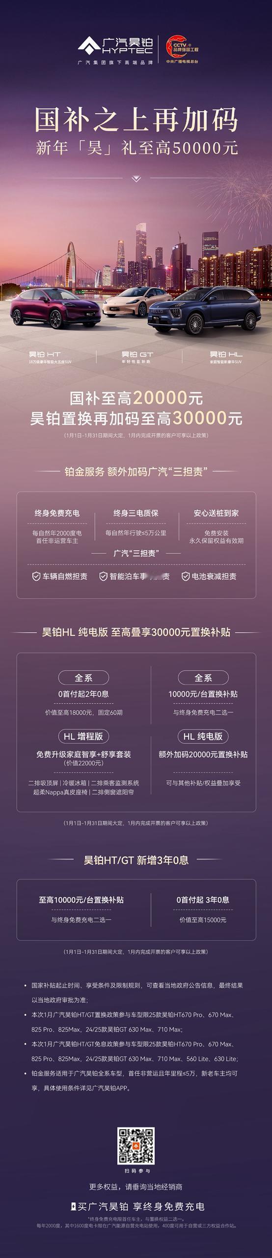 进入2026年,广汽昊铂品牌针对旗下多款车型推出“政企双补”限时礼遇,以最高可享50000元的组合权益。 这其中包括国补部分至高20000元,昊铂品牌置换再加码至高30000元,两者叠加后,用户可享至高50000元购车补贴! 补贴加码之外,广汽昊铂的“铂金服务”还额外加码了广汽“三担责”承诺。昊铂除了提供终身免费充电、终身三电质保、安心送桩等全周期服务,还新增广汽“三担责”承诺,明确对车辆自燃、智能泊车事故、电池衰减提供责任保障,帮助用户解决了用车的后顾之忧。【来自懂车帝车友圈】