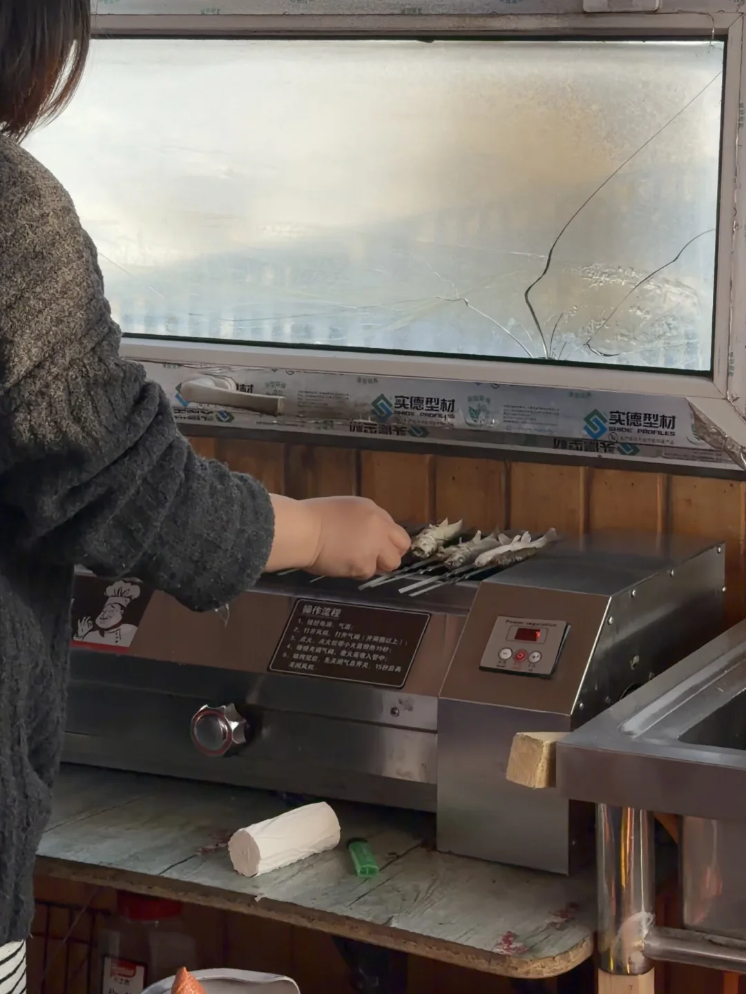 坐在温暖的小屋里喝着热茶吃着零食钓鱼