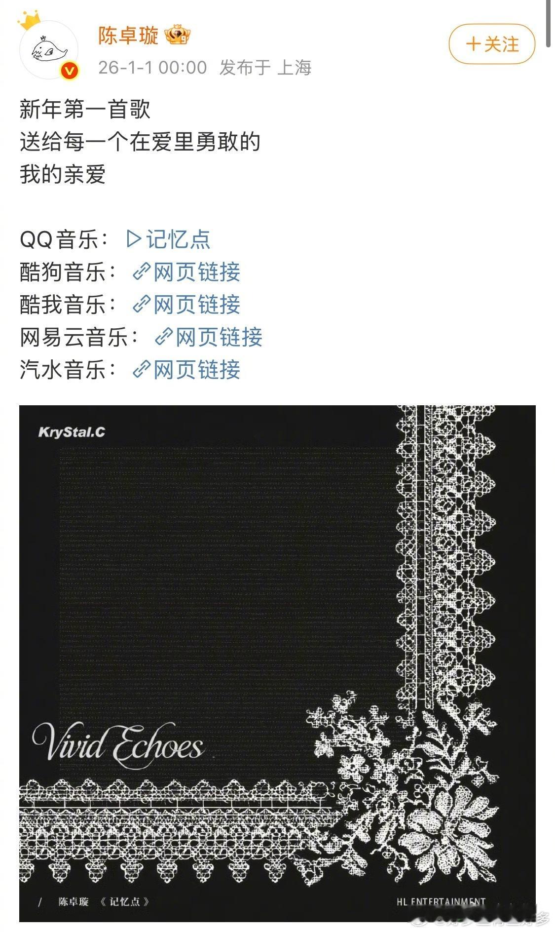 建议陈卓璇新歌纳入防沉迷 跨年新歌《记忆点》太上头!抓耳旋律搭配她清甜又有质感的嗓音,歌词满是深度还甜到心底,老板提前剧透、爸爸亲自写文案打call,听半天根本不够,循环到停不下来!