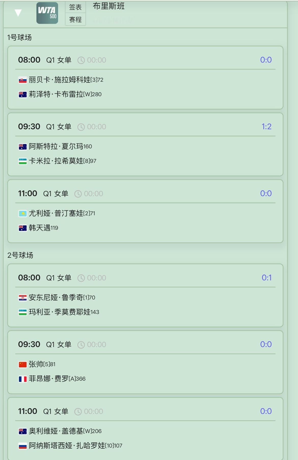 网球talking大会布里斯班女子500赛事明天也将开打,资格赛首日,张帅独自