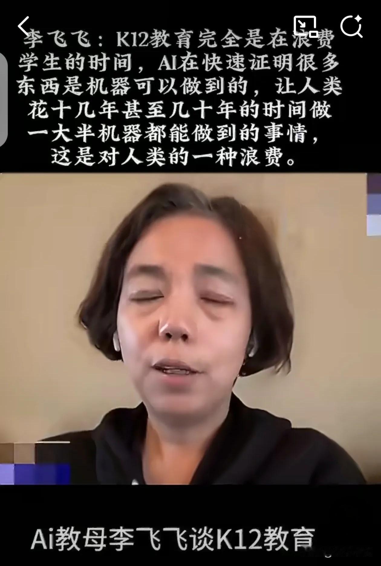 AI教母李菲菲“孩子学K12是浪费时间” AI教母李菲菲在谈到K12时说“K12的教育完全是浪费孩子的时间,AI证明很多东西是机器可以快速实现的” 李菲菲的这种言论是西方社会的主流言论,同时一直试图将这种言论强加给中国,然而中国家长对于教育的焦虑抵消了这种言论。 在中国再先进的AI也只会沦为教育的工具,中国的家长从来不会因为有了AI就放弃了学习。