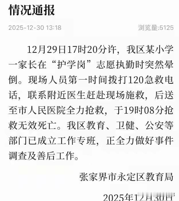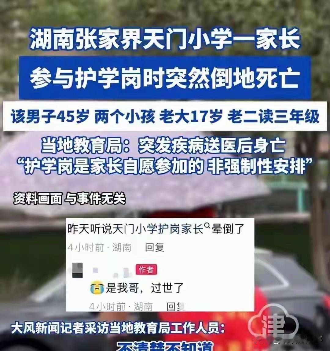 “护学岗”到底有没有意义?近日张家界一小学,一名家长参与“自愿”组织的护学岗时,突然昏倒,紧急送往医院抢救无效离世。 事后当地教育局回复此事,第一句就是,“家长自愿参加的”。这番表态不仅未能平息争议,反而让网友对护学岗的合理性、责任边界等问题提出了强烈的质疑。 “护学岗”本质是由执勤的民警和学校安保打主力,家长只是协助作用。而且学校从未组织过家长需要“护学岗”的专业知识,无非就是走过场。 所谓的“自愿”,多位网友及家长爆料,不少学校的护学岗看似自愿,实则暗藏强制逻辑。有的按班级、学号轮流排班,要求家长扫码打卡签到;有的通过家委会施压,让家长担心“不参与会影响孩子在校处境”,最终陷入“被自愿”的两难境地。 而针对有关该家长到底是执勤了2分钟,还是20分钟,众说纷纭,但无论多久都是按照学校的指示进行的,学校应该负一定的责任。悲剧发生后,“取消护学岗”的呼声在网络蔓延。 大家觉得这个岗位,还有必要继续吗?