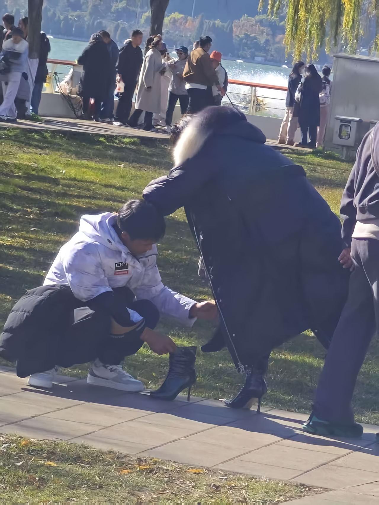 在公园散步看到超暖心的一幕!有人特意蹲下帮同伴整理高跟鞋,小小的动作满是温柔,瞬间被这个细节治愈了~你们生活中遇到过哪些暖心的小瞬间? 暖心瞬间 生活中的小美好