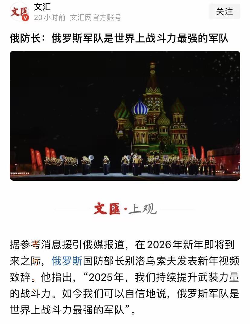 新年的第1个笑话出现了。[灵光一闪] 俄罗斯竟然说他们的军队是全球最强的军队,至少美国人不服吧!乌克兰人可能也不会服气吧!因为在某些方面他们是不是要比俄罗斯更强啊? 这话说出来,估计好多人都在摇头。“全球最强”,听着挺威风,可这旗子立在俄乌前线的战壕旁边,怎么看怎么别扭。乌克兰那边不服啊,他们前线用的无人机,去年九成六都是自己家生产的。 这可不是开玩笑,从2022年到现在,他们的军工企业像打了气一样,数量猛增了1.4倍。就说最近吧,莫斯科附近一栋公寓楼被撞,俄方说一夜就拦截了111架乌克兰无人机。这些“小飞虫”多到让排名表上的火炮数量都显得有点尴尬。 美国人更不服了。最近他们刚通过一个9010亿美元的国防法案,每年还要挤出一笔钱来支持乌克兰。但问题是,这些远方的支持,真能堵上前线的窟窿吗? 有分析就担心,要是援助跟不上,到2026年乌克兰的防空可能会撑不住。花钱买的“最强”,和真能顶用的“最强”,有时候不是一回事。 俄罗斯确实也有“家底”。最新的全球军力排名里,它排第二。像多管火箭炮、自行火炮这些硬家伙,它的家底数量被评估为世界第一。地大,资源多,这也是实打实的。可这仗打了这么久,乌克兰这边也有了自己的算计。 他们内部文件写着,计划到2026年要年产800万架无人机,想当这个领域的“世界冠军”。俄方那边的预计产量,可能只有200多万架。这还怎么比?战争的样子都变了。 说到底,这个“全球最强”的标签,早就不是一张简单的成绩单了。它现在更像一块被拉扯的布,一头是俄罗斯庞大的传统军力库存,另一头是乌克兰开足马力的战时生产线,中间还夹着美国国内没完没了的预算扯皮。 乌克兰的计划看起来有点疯狂,俄军的反无人机战法也在天天升级。两边都像掉进了消耗战的泥潭,资源和耐心都在一点点耗掉。 所以啊,吵谁最强,不如看看战场上谁更能扛。乌克兰国防工业的产值,三年里据说增长了35倍。俄罗斯的军队规模,据说在去年也第一次停止了增长。 大家都在咬着牙,看谁能熬到最后。这场仗,拼的不是纸面上的第一名,而是看谁的口袋更深,看谁的意志更不容易被磨光。 各位读者你们怎么看?欢迎在评论区讨论。
