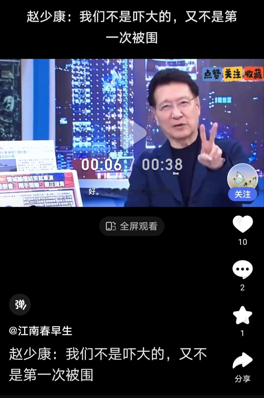 蓝皮绿骨的赵少康最可恶! 当解放军“正义使命一2025”在轰轰烈烈进行军演时,也照出了台湾有些“妖魔鬼怪”,比如赵少康就是其中之一。 当军演时,台湾部分股市不降反升,此刻赵少康对军演冷嘲热讽的说道:“台湾人不是吓大的,围吧!又不是第一次,围近点、远点都可以,无所谓”。说真的,要不是大陆看在台湾同胞情份,就台湾那点军事实力,收拾台湾根本没有任何压力,在面对今天中国大陆的综合国力,台湾根本没有任何“狂妄”的资本。 其实,蓝皮绿骨的赵少康,有时比绿营“青鸟们”更可恶。众所周知,解放军此次军演主要是为了震慑外部势力及“台独”分子。赵少康身为蓝营,本身党内原则上就是反对“台独”,而他却反其道而行之,实在可恶。但是这也不是赵少康第一次这样露出蓝皮绿骨,在郑丽文竞选中国国民党党主席时,他就已经充分表现出来了。他不光在竞选时污蔑郑文丽得到“大陆”支持,还要求郑丽文清除“身边”统派人土。这已经明显坐实了他就是典型的蓝皮绿骨的“独派”人土。 然而,台湾实现统一回归祖国是必然的结果,任何背叛祖国、阻碍统一的行为,终将没有好下场。