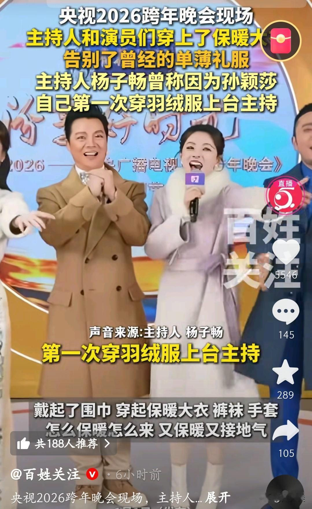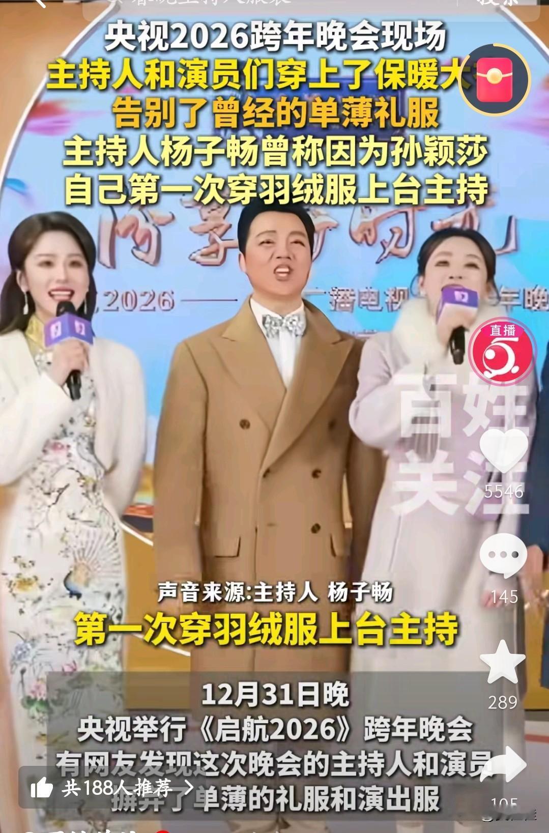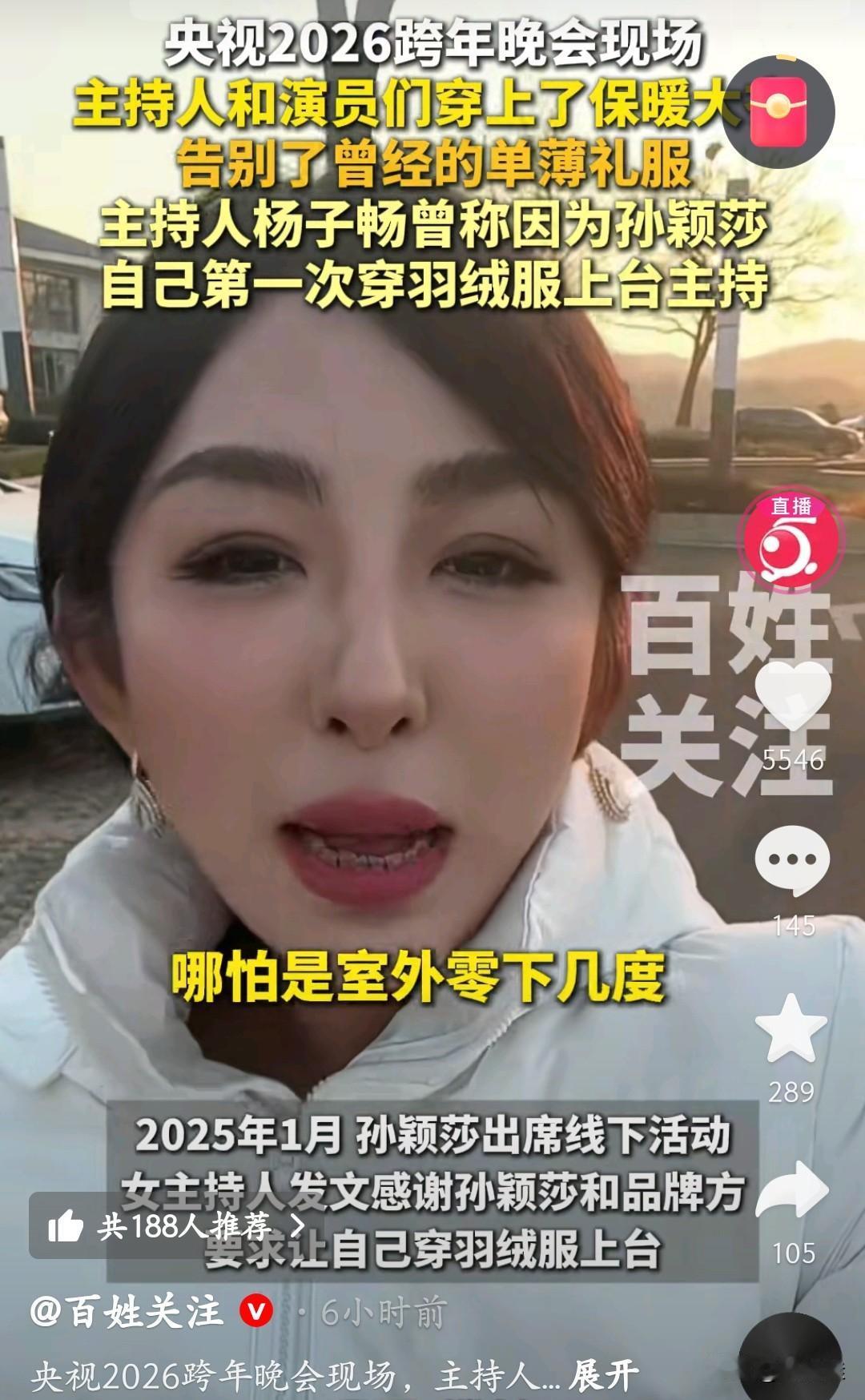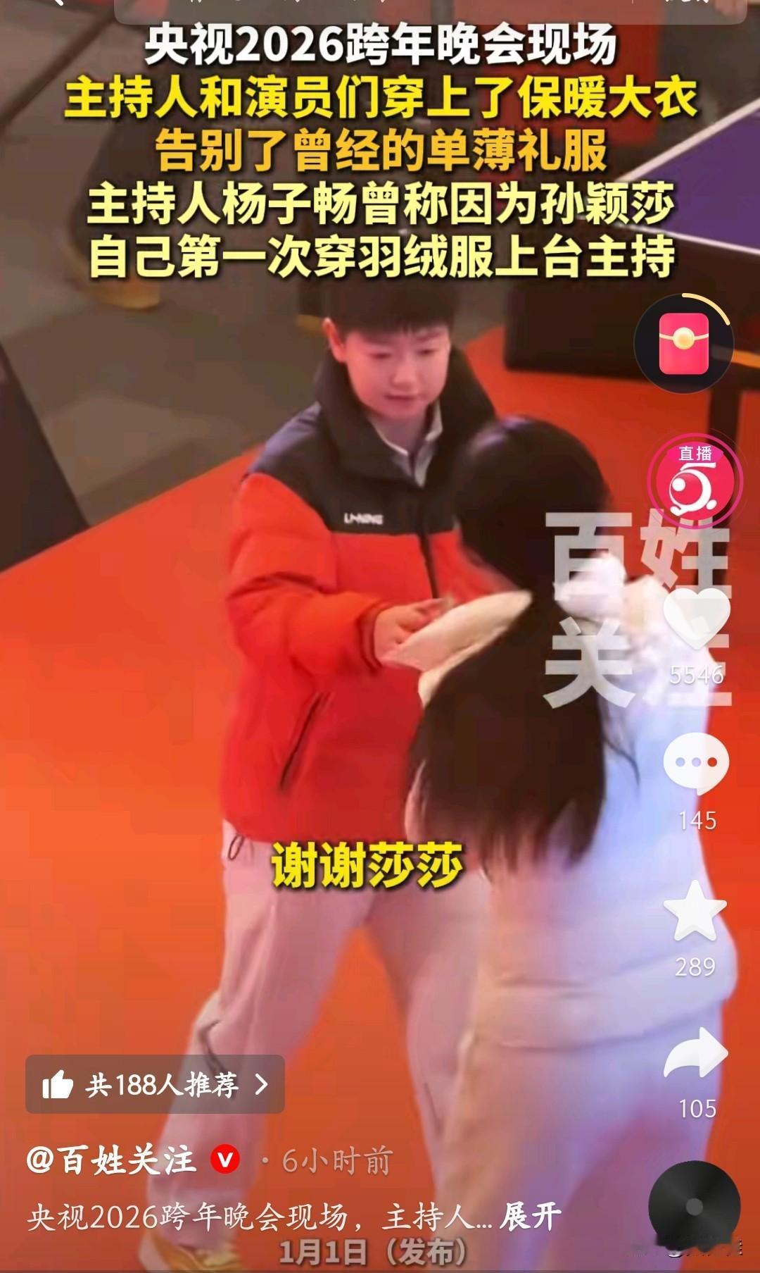 这是莎莎的功劳!央视2026跨年晚会上,主持人和演员们终于不用硬扛严寒,全员换上保暖大衣、羽绒服出镜,再也看不到往年“美丽冻人”的画面了。 主持人杨子畅都说,这是自己第一次穿羽绒服上台主持,而这一切都源于孙颖莎。早在2025年1月,孙颖莎出席线下活动时,就帮主持人跟品牌方提议,让主持人能穿羽绒服上台,这份贴心被记到了现在。 今年跨年夜不管是室外零下几度的场地,还是舞台上的主持环节,大家裹着厚实的保暖装,围巾、手套也安排上,怎么暖和怎么来,既不影响节目效果,还多了份接地气的亲切感。 一件羽绒服,暖的不只是主持人的身体,更是藏在细节里的人情味。必须给莎莎的暖心举动点个赞,这样的温暖细节,才是跨年晚会该有的样子!