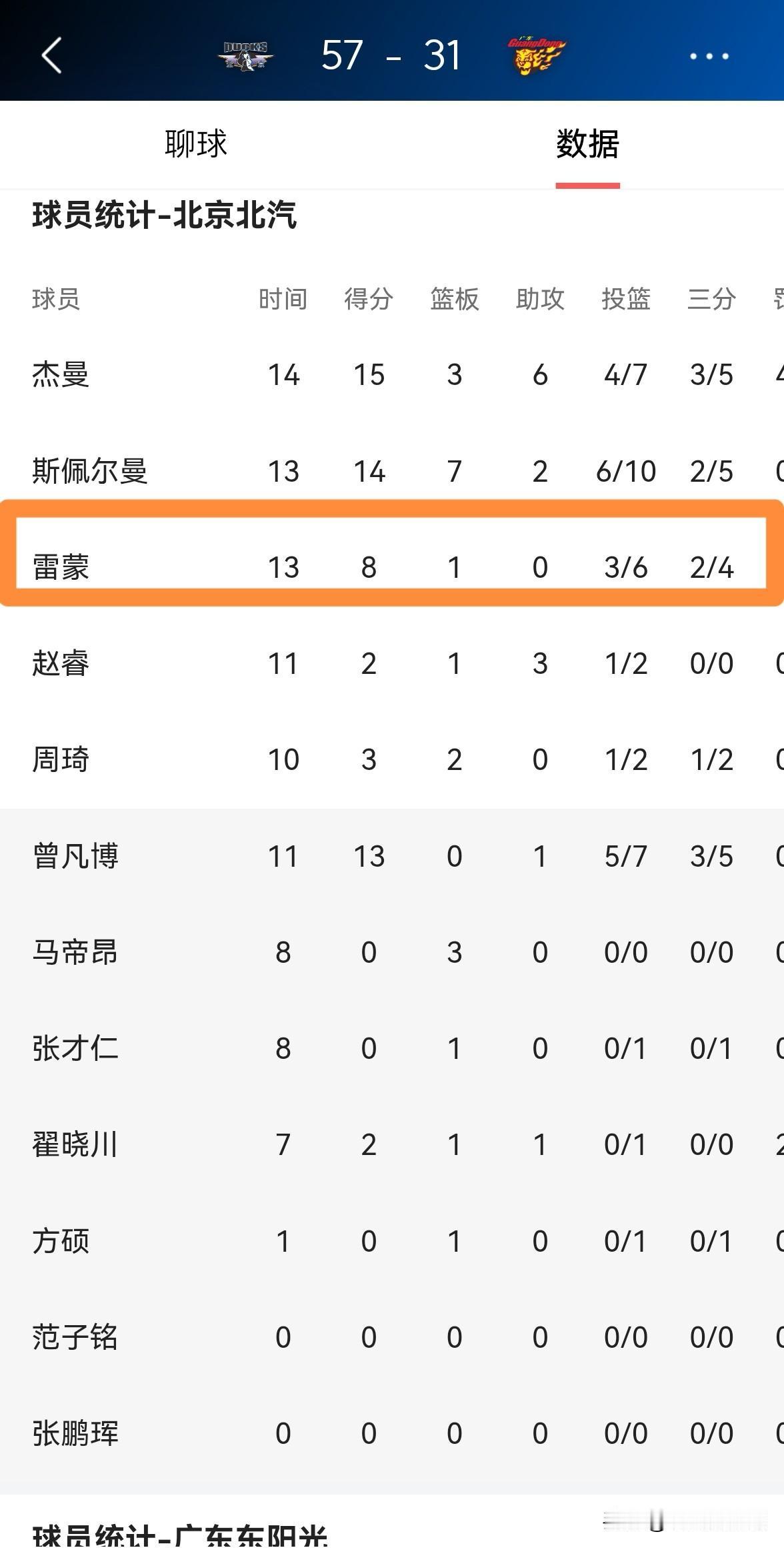 我真的要好好夸夸北京北汽老将雷蒙!在今天北京北汽主场迎战广东东阳光的上半场比赛中,老将雷蒙在攻防两端兢兢业业、勤勤恳恳,他在首发出战的13分钟里,投篮6中3,其中三分球4中2非常高效的得到8分,还有1篮板,他的场上正负值为+14。 坦白说,北京北汽能够拥有雷蒙这样的老将真是太幸运了,雷蒙在攻防两端都堪称球队的楷模。