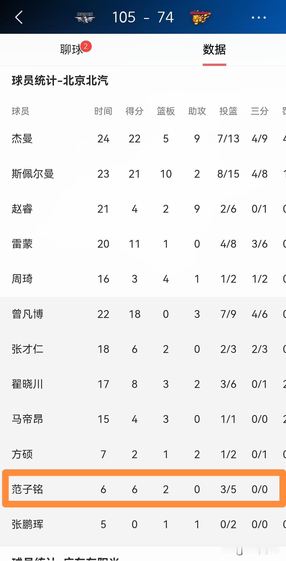 我忍不住要怒赞北京北汽大将范子铭的拼搏精神!在今天北京北汽主场以105:74大胜广东东阳光的比赛中,虽然范子铭仅仅替补出战6分钟,但是他在攻防两端都拼劲十足,投篮5中3得到6分2篮板,他的场上正负值为+4。 我相信北京北汽主帅许利民一定会看到范子铭的努力,像这样一名努力拼搏的球员不应该坐冷板凳。