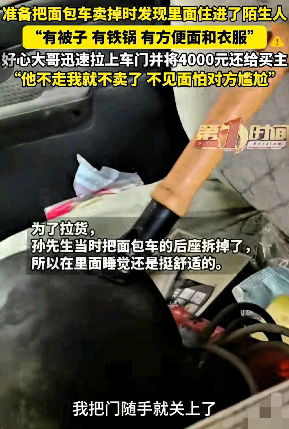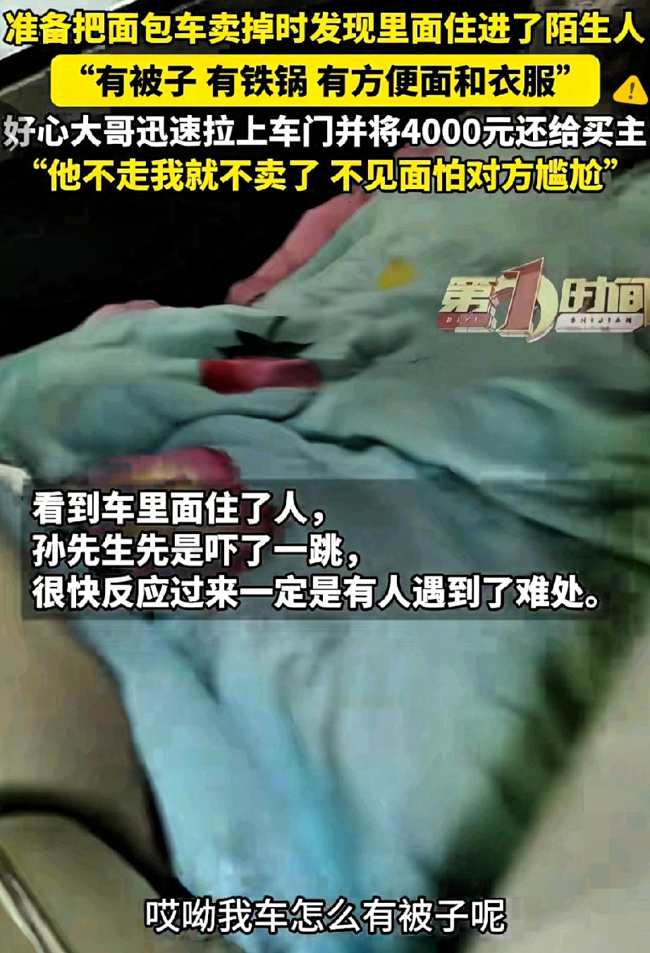 这大哥的格局,活该他以后东山再起! 河南周口这位孙先生,真的把善良刻进骨子里了! 明明亏了钱想卖闲置面包车周转,打开车门却发现有人把“家”安在了里面,换别人可能早就报警或清东西了,他倒好,直接取消交易,还倒贴100块给车行当路费,就为了让对方踏实过个年。 有人说他傻,放着4000块不要,但我觉得这才是最高级的善良——他不光给了陌生人一个容身之所,更悄悄护住了对方的体面。 自己生意不景气,却从没断过做公益的习惯,从一年捐十万到现在的一万,这份善心从来没被困境打败过。 善良从来都不是一种选择,而是刻在骨子里的本能。 你身边有没有这样默默行善的普通人?