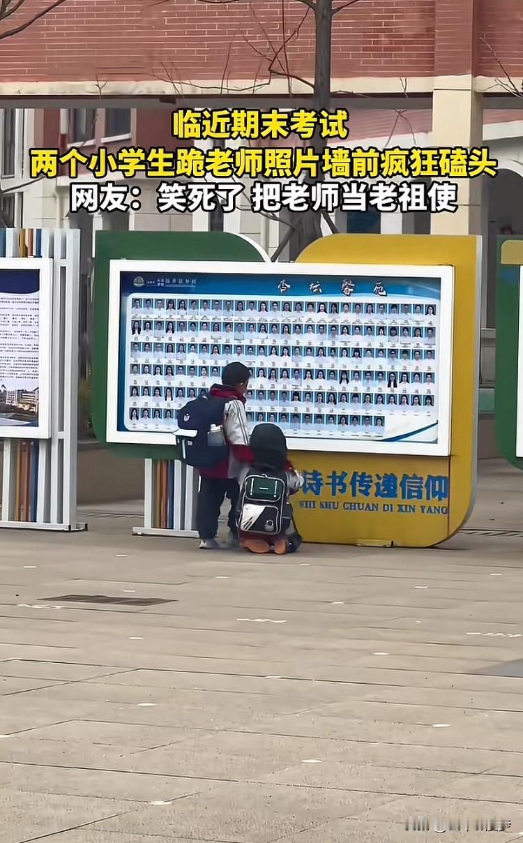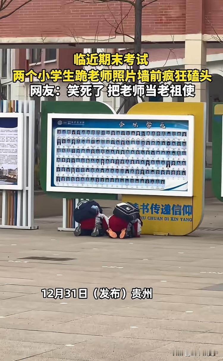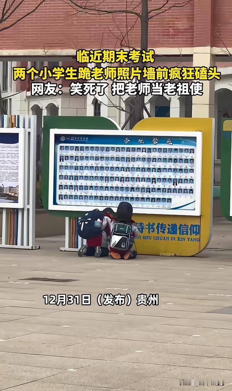 2025年12月31日贵州,临近期末考试,一所学校的两名学生背着书包,在走廊教师照片墙前郑重跪拜磕头,模样虔诚认真,这一幕被老师拍下传至网上后引发热议,网友纷纷调侃孩子是把老师当成神明、文曲星,打趣其脑回路清奇,场面好笑又耐人寻味。孩子们的举动看似荒诞可爱,实则是教育焦虑下的朴素表达,年纪尚小的他们不懂努力与成绩的必然关联,面对考试压力只能将作为知识权威的老师当作好运寄托,用跪拜寻求心安。 这一幕也戳中了当代教育的深层痛点,孩子们跪拜的不仅是师长,更是教师身份背后的评价权力,是对考试分数的恐惧,更是层层学业压力的具象化体现,如今孩子被考试排名、家校期待等多重压力包围,令人心疼。更值得深思的是,真正的尊师重道在于敬畏知识、感恩育人者,而非形式化跪拜,现代师生关系应是平等尊重而非盲目崇拜。这场小风波像一面镜子,照见当前教育生态的不足,我们更应反思如何为孩子减负,建立多元化评价体系,让教育回归培养完整之人的本质,让孩子明白成功源于努力,而非寄望虚无好运。 校园跪拜