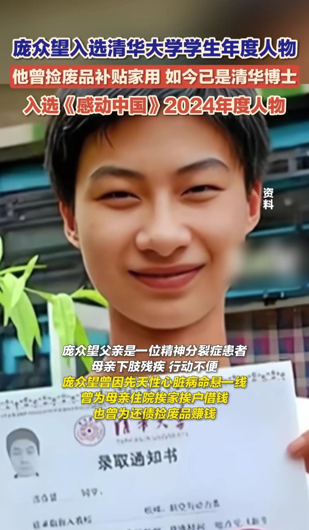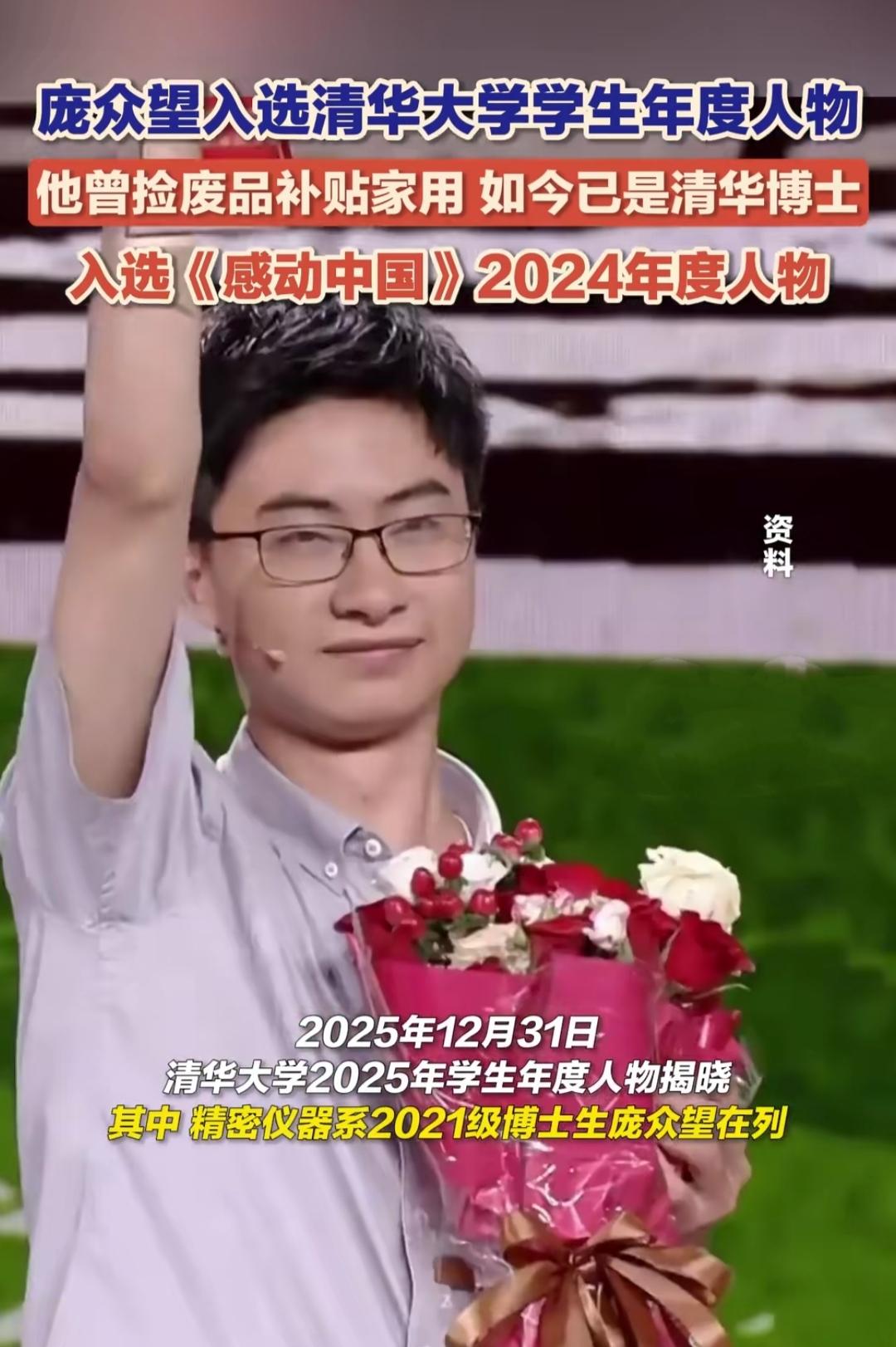 庞众望入选清华2025年学生年度人物的消息火了,这个在苦难里长大的少年,骨子里藏着最柔软的温柔。父亲患精神疾病、母亲下肢残疾,他自幼患先天性心脏病,从小捡废品养家,却从没抱怨过生活,反而把善意都回馈给身边人。 考上清华后,他带着母亲一起上学,边读本科边照顾家人;成为精密仪器系博士生后,他参与“春蕾支教计划”、返乡做科技普及,帮更多寒门学子解决求学难题。他说自己淋过雨,所以想为别人撑把伞,曾压在他身上的苦难,终化作温暖他人的力量。 从捡废品的少年到手握3项国家发明专利的清华博士,再到《感动中国》2024年度人物,他的故事从不是单纯的“逆天改命”,而是让我们看到:真正的强大,是被生活捶打过,依然选择善良和温柔。