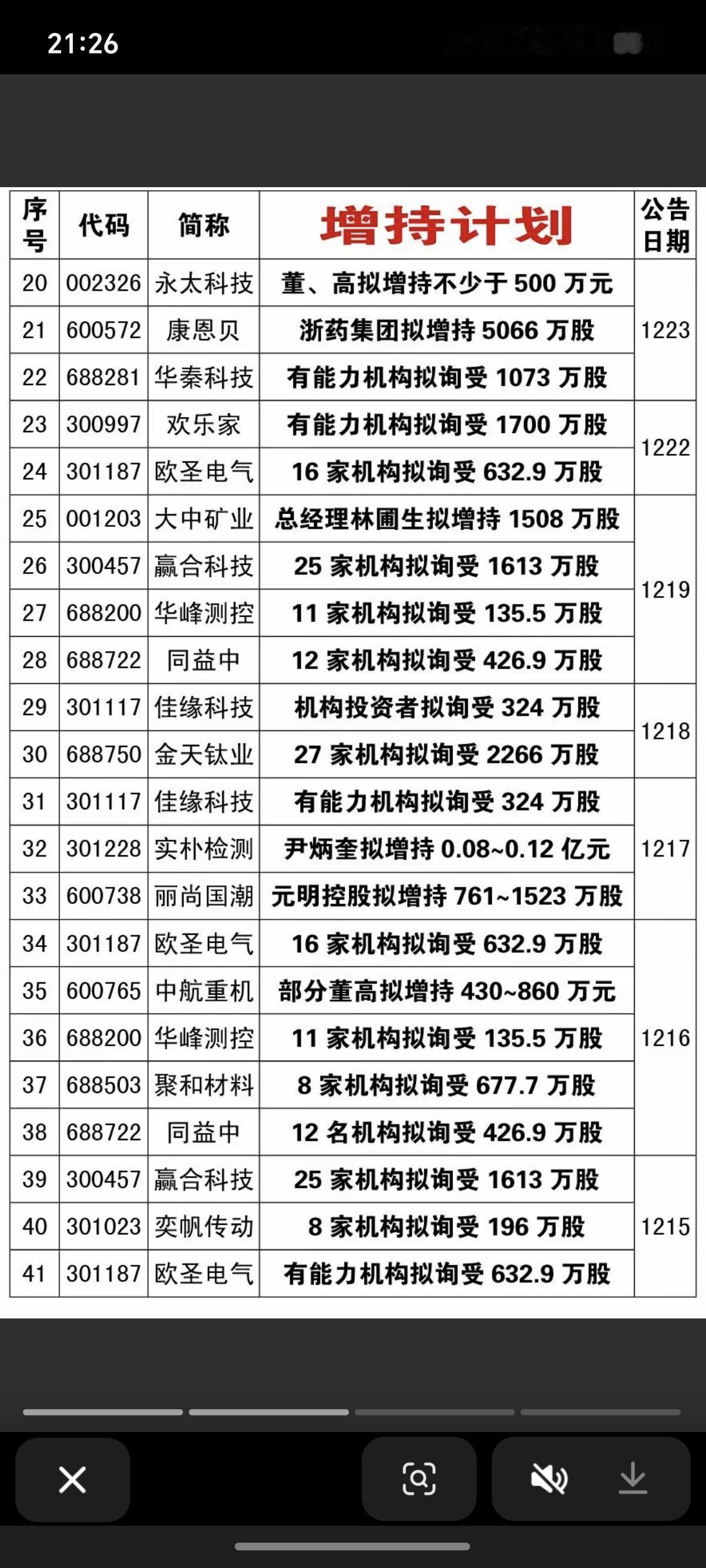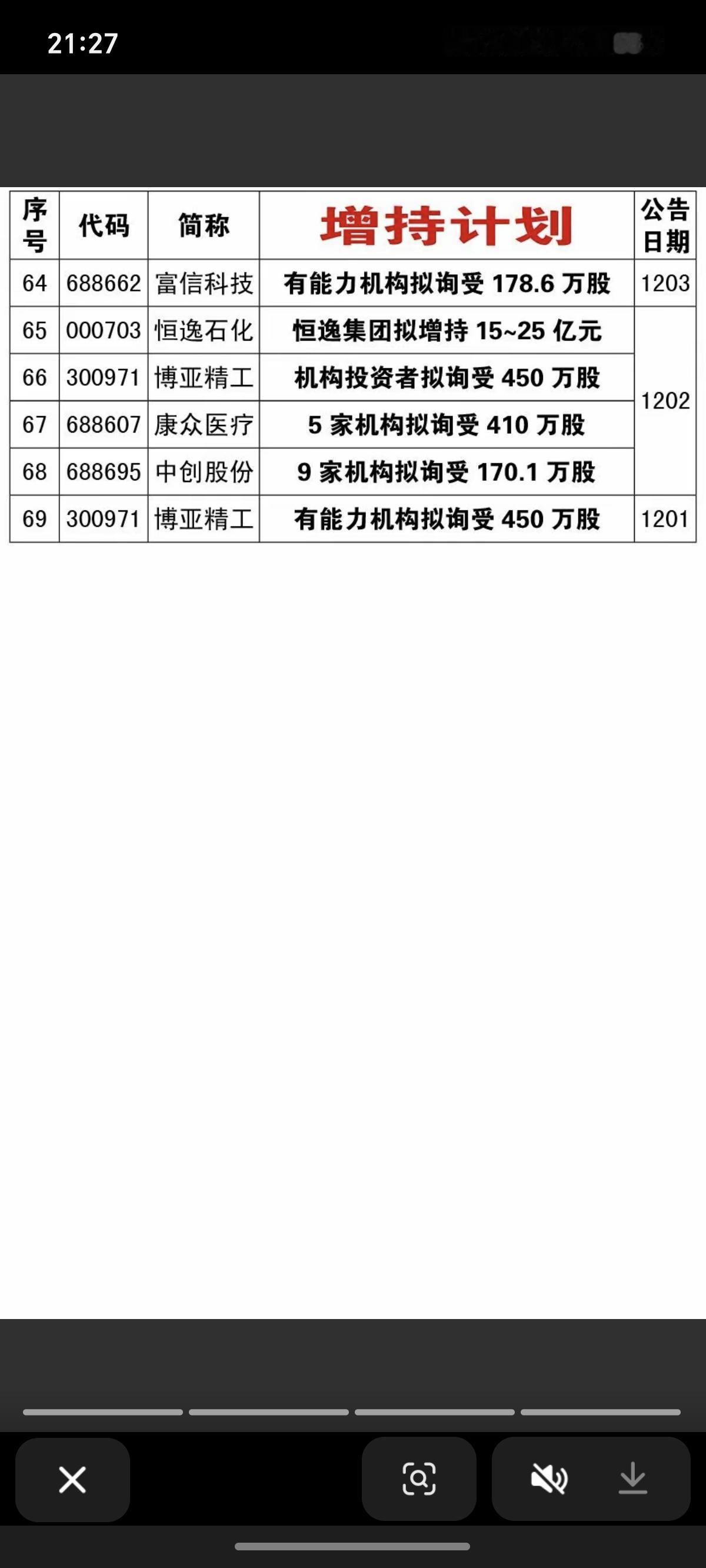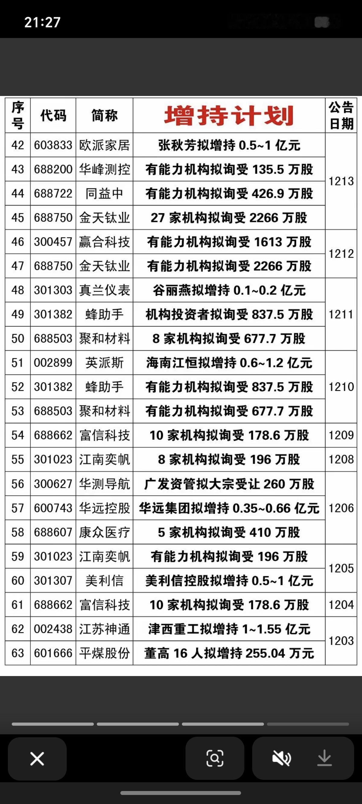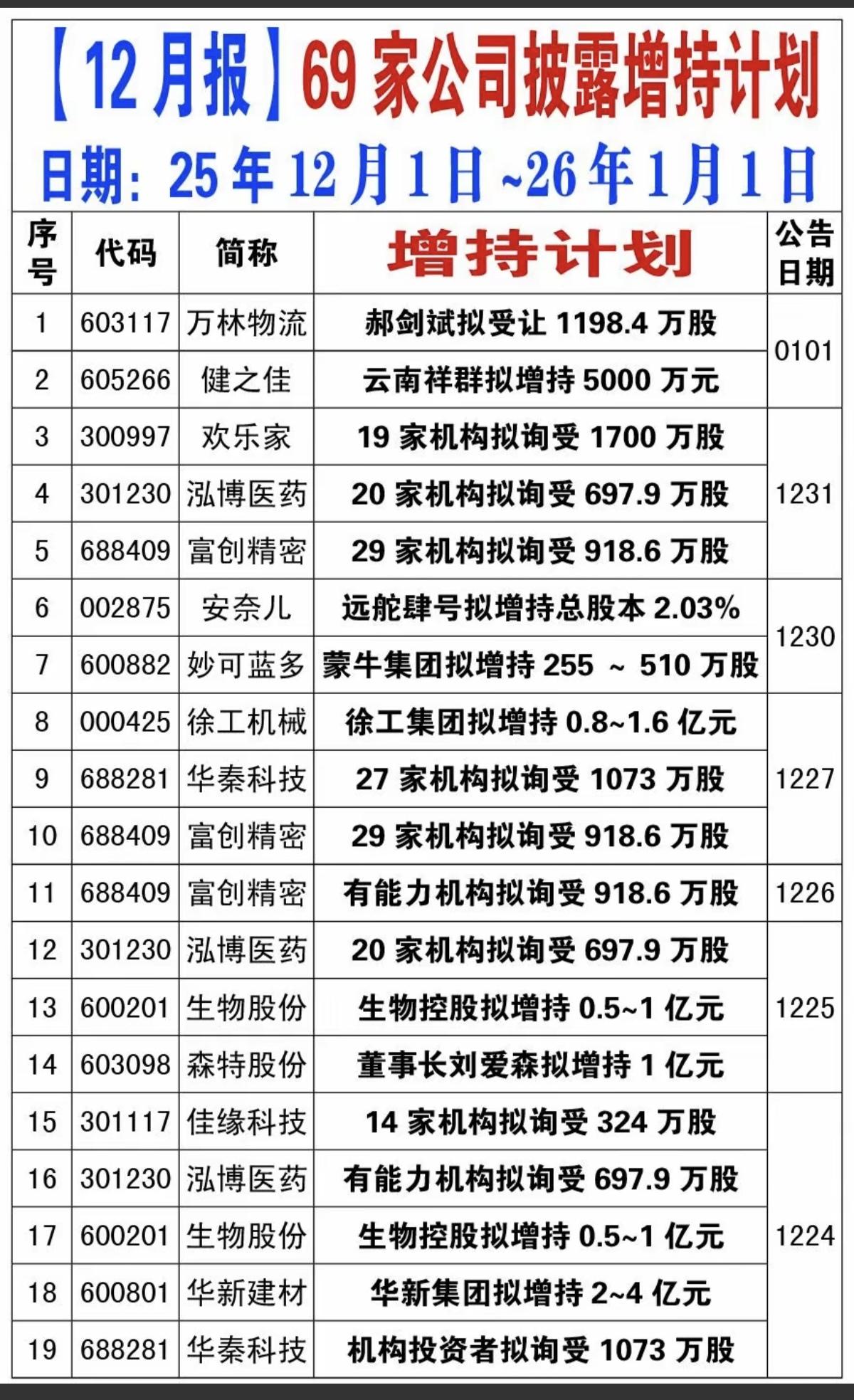 12月报: 69家公司披露增持计划! 12月份累计有69家公司披露增持计划。 大盘这个点位,敢于增持,绝对是好公司,也是充分看好上市未来的发展。