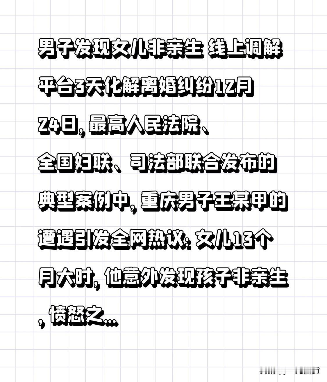男子发现女儿非亲生 线上调解平台3天化解离婚纠纷 12月24日,最高人民法院、全国妇联、司法部联合发布的典型案例中,重庆男子王某甲的遭遇引发全网热议:女儿13个月大时,他意外发现孩子非亲生,愤怒之下提出离婚,却在"重庆调解在线"数字平台的帮助下,仅用3天就与妻子达成和解协议。 这场原本可能撕破脸皮的家庭纠纷,如何通过线上调解化干戈为玉帛? 记者注意到,平台整合了法院、妇联、司法所等多部门资源,当事人只需上传证据、在线沟通,就能获得专业调解员的指导。数据显示,该平台今年已成功调解婚姻家庭纠纷超过1.2万起,平均耗时仅4.7天,较传统诉讼效率提升60%。 案例中,王某甲通过平台提交亲子鉴定报告后,系统自动匹配了家事法官和心理咨询师组成调解团队。"我们没有见面,全程通过视频沟通。"王某甲在调解记录中写道。最终双方协议离婚,孩子抚养权归母亲,父亲每月支付抚养费直至成年,这场持续1个月的僵局在线上画上句号。 网友热议: "这种方式太人性化了,避免双方在法庭上互相指责" "3天解决真是神速!传统诉讼至少要3个月" "希望全国推广,减少家庭矛盾对孩子的伤害" 据了解,这类线上调解平台已在全国28个省市试点,涵盖婚姻、劳动、邻里等6大类纠纷。最高法相关负责人表示,典型案例的发布旨在推广"数字调解"模式,让矛盾化解更高效、更温情。遇到类似纠纷,你会选择线上调解吗? 非亲生子女维权 养育非亲生女 非血缘抚养困境