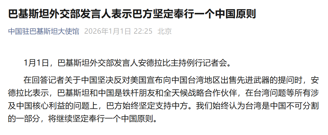【巴基斯坦外交部发言人表示巴方坚定奉行一个中国原则】#巴基斯坦称和中国是铁杆朋友#1月1日,巴基斯坦外交部发言人安德拉比主持例行记者会。在回答记者关于中国坚决反对美国宣布向中国台湾地区出售先进武器的提问时,安德拉比表示,巴基斯坦和中国是铁杆朋友和全天候战略合作伙伴,在台湾问题等所有涉及中国核心利益的问题上,巴方始终坚定支持中方。我们始终认为台湾是中国不可分割的一部分,将继续坚定奉行一个中国原则。网页链接 #巴基斯坦始终坚定支持中国#