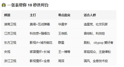 今晚(2025年12月31日)全国八台主流跨年晚会集体开唱,以下为最值得关注的五大卫视/平台节目单+看点速览,方便你提前锁定频道、挑好“主战场”—— 1️⃣ 湖南卫视「2025-2026跨年演唱会」 播出:19:30 湖南卫视 / 芒果TV 看点关键词:真唱·巡游舞台·弹幕烟花许愿池 零点王牌:华晨宇连唱三首+倒计时许愿 C 位 回忆杀:那英 7′ 金曲串烧、王心凌《爱你》全场甜炸 嚯!这阵仗,八台晚会同时开场,遥控器今晚可算是要忙坏了。提前瞄一眼节目单,心里有个谱,不然到时候手忙脚乱,错过自家“爱豆”可就亏大发了。 湖南卫视这架势,是把“玩真的”仨字写脸上了。“真唱”当头,这勇气得给个赞。是骡子是马,今晚都得拉出来遛遛,观众耳朵可是雪亮的。那个“巡游舞台”听着挺新鲜,估摸着不是让明星干站着,得动起来,跟观众互动感应该不赖。至于“弹幕烟花许愿池”,估计是边看边发弹幕,到时候满天飞愿望,科技感和仪式感都给你拉满。 零点前让华晨宇连唱三首压轴,这分量够足。他的舞台爆发力没得说,就是不知道今年会整啥新活,是继续炸场子还是来点深情的?加上倒计时许愿,这零点时刻的氛围算是被他承包了。回忆杀这块,那英大姐的7分钟金曲串烧,估计能勾起好几代人的回忆,从《征服》到《默》,全场大合唱预订。王心凌的《爱你》就更不用说了,杀伤力跨越年龄层,音乐一响,谁的DNA动了我不说。 不过话说回来,晚会扎堆,热闹是热闹,选择困难症也犯了。除了湖南台,其他几家肯定也藏着绝活。比如江苏卫视,估计又在舞美和虚拟现实上砸钱,搞出电影大片的感觉;东方卫视可能主打语言类和海派文化,笑点和情怀兼备;浙江卫视跑男家族和音综熟脸少不了,热闹接地气;B站的跨晚,那肯定是二次元和年轻潮流的天下,整活能力一流。 咱普通观众看晚会图个啥?不就图个开心,图个氛围,能听到几首好歌,看到几个惊艳的舞台,和家人朋友一起乐呵乐呵,迎接新年。各台拼命卷技术、卷阵容,最终受益的还是咱们。到时候手机、平板、电视多屏互动,哪个节目精彩就切哪个,这场“遥控器大战”,咱稳赢。 各位读者你们怎么看?欢迎在评论区讨论。2026跨年档 跨年晚会图鉴 跨年晚会歌单 湖南台跨年舞台 跨年晚会门票