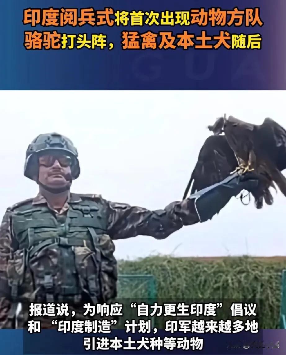 2026年印度阅兵又要整活了,将要有动物方阵上场了。 这支动物方阵由两匹双峰骆驼打头阵,后面跟着山地矮种马,猛禽和印度本土犬队等动物! 相比由人操控的摩托车叠罗汉表演,这支动物方阵显得更加新颖和特殊。 其队员有很大的不稳定性,需要人投入很大的精力训练,才能让这支队伍训练有素! 印度阅兵采用动物方阵是有原因的, 这些动物都是印度本土产的,主要是想更好的响应“自力更生”和“印度制造”这两大目标。 虽然,印度每年的阅兵式都玩的很花,但大家不能因此认为他们不着调,印度的整体实力还是不容小觑的。 毕竟当前印度GDP已超过日本,世界排名第四,三年内有望超过德国,排名第三!