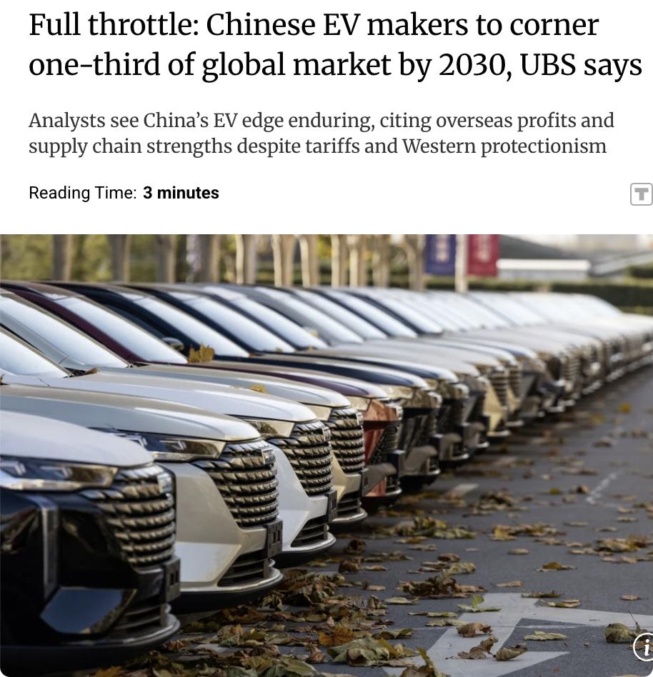 外媒:据瑞银预测,到2030年中国电动汽车制造商将占据全球汽车市场约三分之一的份额,并且大部分利润将来自海外。 尽管西方贸易壁垒不断增加,但中国电动汽车的优势依然稳固。瑞银表示,尽管欧洲电动汽车市场增长放缓以及对中国电动汽车的关税和保护主义政策是主要阻碍因素,但近期已显示出一些追赶迹象。 目前海外市场已占到中国电动汽车行业销量的约20%,部分车企海外利润占比高达50%,这凸显了中国车企对国际扩张的依赖。行业高管指出,这并不意味着中国将独自主导市场,全球竞争正围绕少数大型电动汽车平台展开,印度等新兴参与者仍有发展空间。